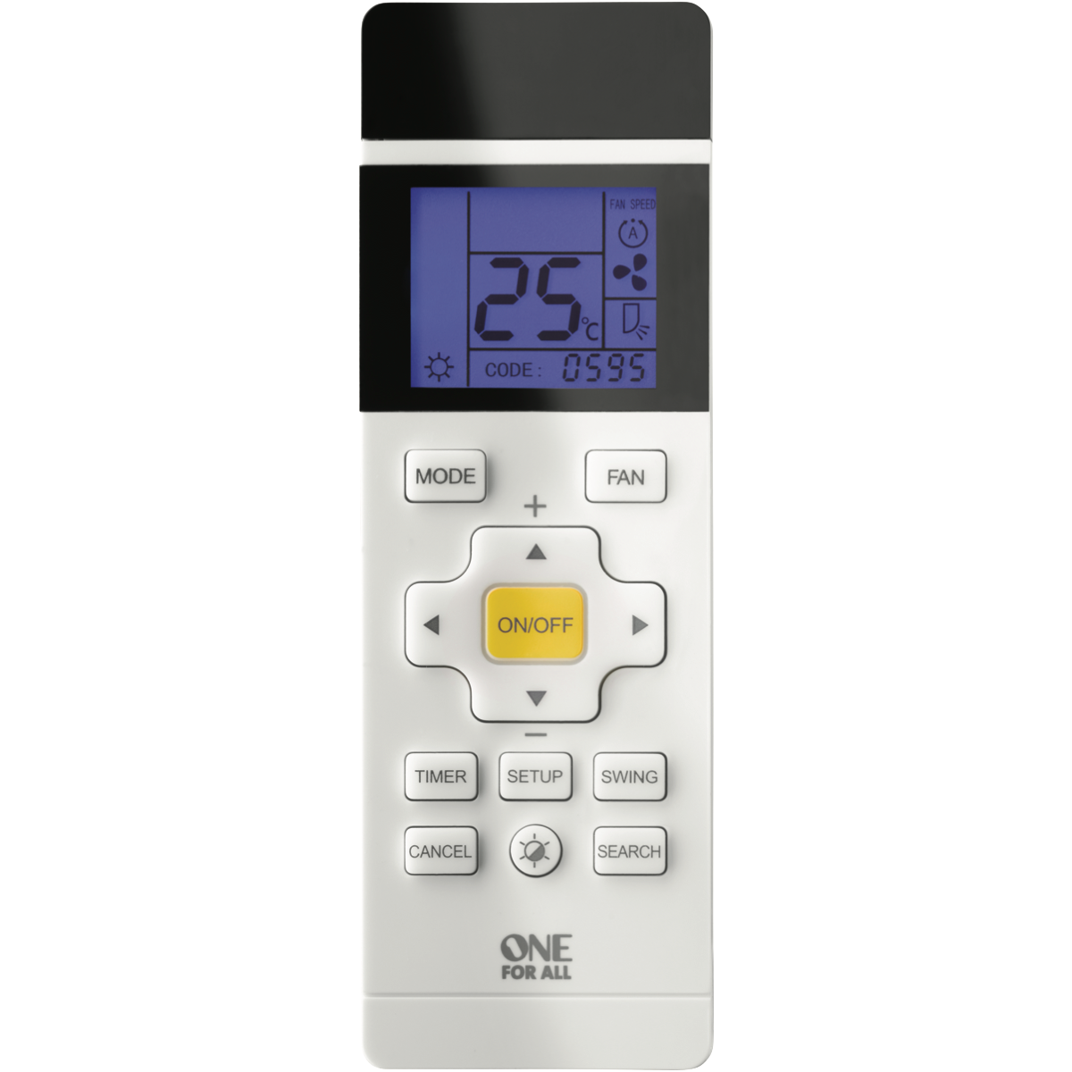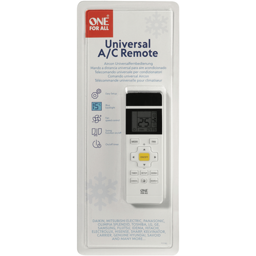 Control your air conditioner from the comfort of your couch with the One For All Aircon Remote Control. This universal remote lets you operate your IR air conditioning unit without having to get up. With the ability to control multiple brands you can say goodbye to juggling multiple remotes. The sleek and compact design allows you to store the remote neatly in a drawer when not in use. Setup is a breeze - simply program your air conditioner brand into the remote by following the easy to understand instructions. Adjust modes set temperatures control fans and more with the intuitive button layout. The remote is designed for daily use with durable buttons that won't wear out over time. It also comes backed by a 1 year manufacturer's warranty for peace of mind. Bring convenience to your home cooling with the One For All. The manufacturer's part number for this product is UE-URC1035.