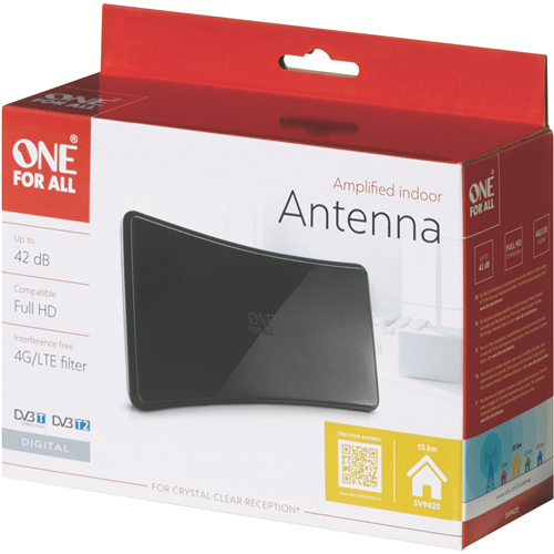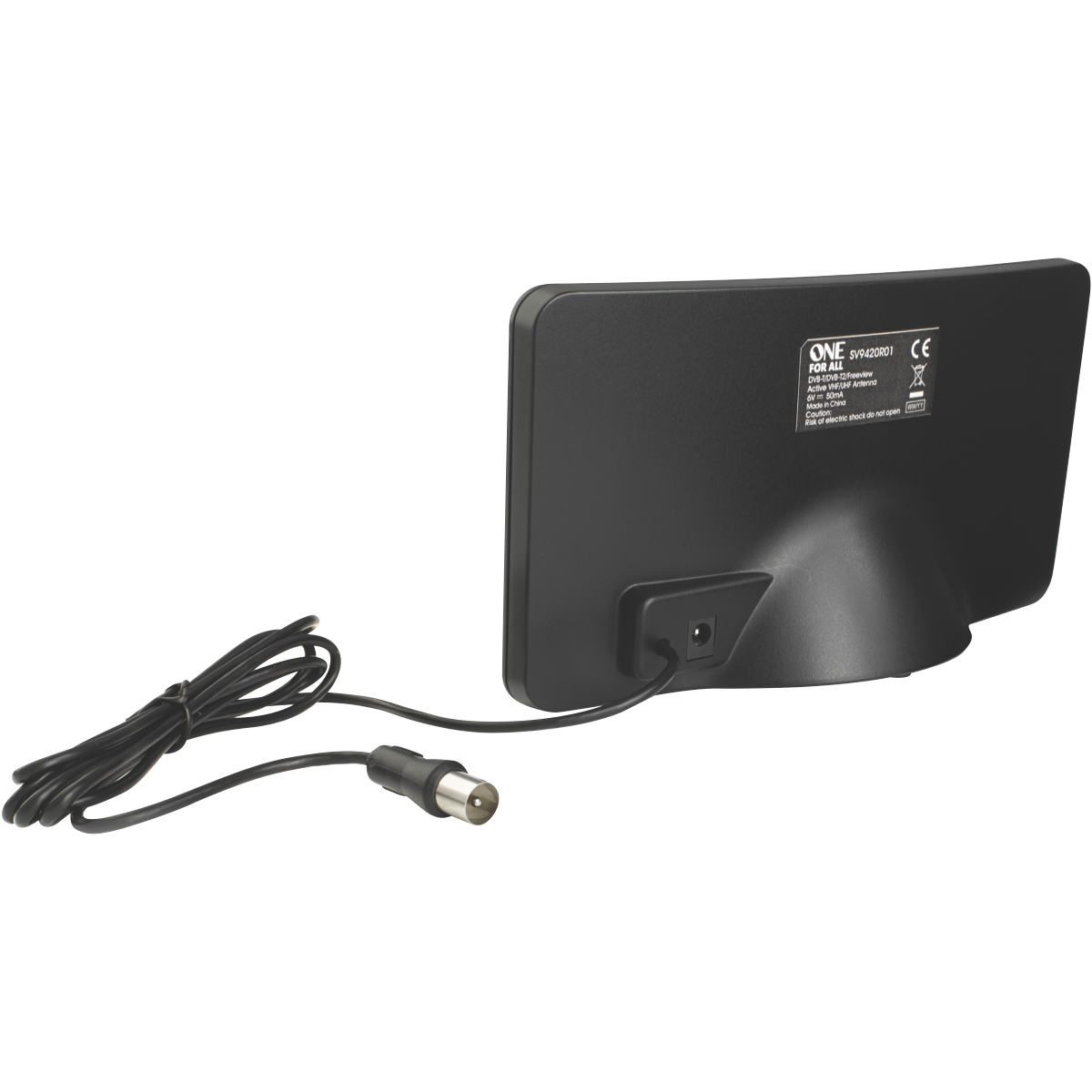 Enhance your TV viewing experience with the One For All 42dB Gain Amplified Indoor Antenna. This high-performance indoor antenna boosts weak digital TV signals with its 42 decibels gain to deliver clear reception. Slim and lightweight it conveniently mounts on walls or sits on entertainment units to pull in channels up to 120km away. The 6VDC power adapter ensures a stable power supply for uninterrupted viewing while the sleek low profile design blends into your home decor seamlessly. With simple plug-and-play installation start enjoying free-to-air HD channels on your TV instantly. The manufacturer's part number for this product is UE-SV9420. Bring home this indoor antenna today for fuss-free access to digital TV broadcasts.