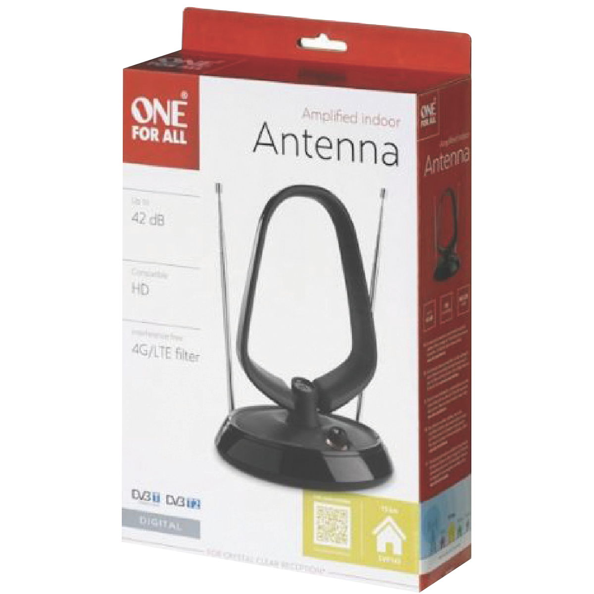 Enjoy crystal-clear AV signals and access up to 15km of range with the One For All HD Indoor Antenna. This 220mm tall and 160mm deep indoor antenna amplifies signals by 42 decibels for smooth interference-free viewing. With simple plug-and-play installation this antenna makes it easy to cut the cord and access free-to-air TV channels. Its compact low-profile design blends into any room decor for discreet out-of-sight placement. Built to last this durable antenna pulls in stations with ease. Tune into all your favorite shows and sporting events in vivid high definition picture quality. The manufacturer's part number for this product is UE-SV9143. Bring home the One For All antenna for effortless over-the-air entertainment.