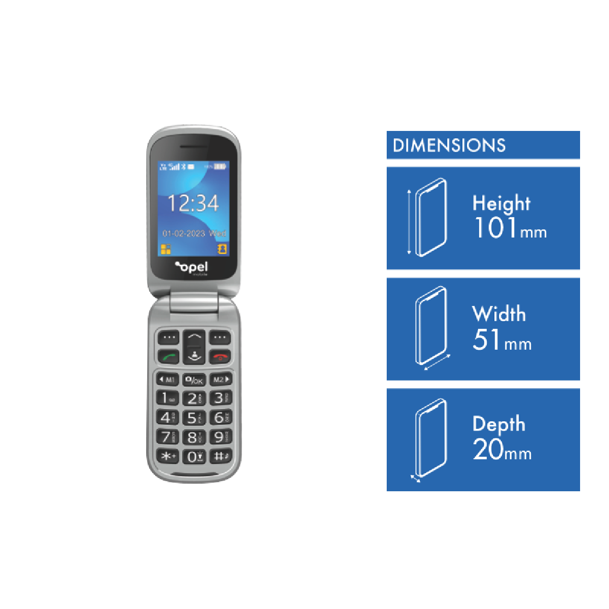 The Opel Mobile Flip Phone 6 is a 4G mobile phone that lets you connect on the go. With a 2MP front camera you can capture selfies and video call friends and family. Store plenty of photos videos music and apps with 32GB of internal memory that's expandable for even more storage. Stay connected with Wi-Fi and Bluetooth support. The 1400mAh battery provides hours of talk time. Measuring just 57mm wide 21mm deep and 108mm high this compact and lightweight 130g flip phone easily fits in your pocket or bag. Available in classic black the Opel Mobile Flip Phone 6 comes with a 1 year manufacturer's warranty. The manufacturer's part number for this product is 5566443. Check out this nifty flip phone today for all your communication needs.