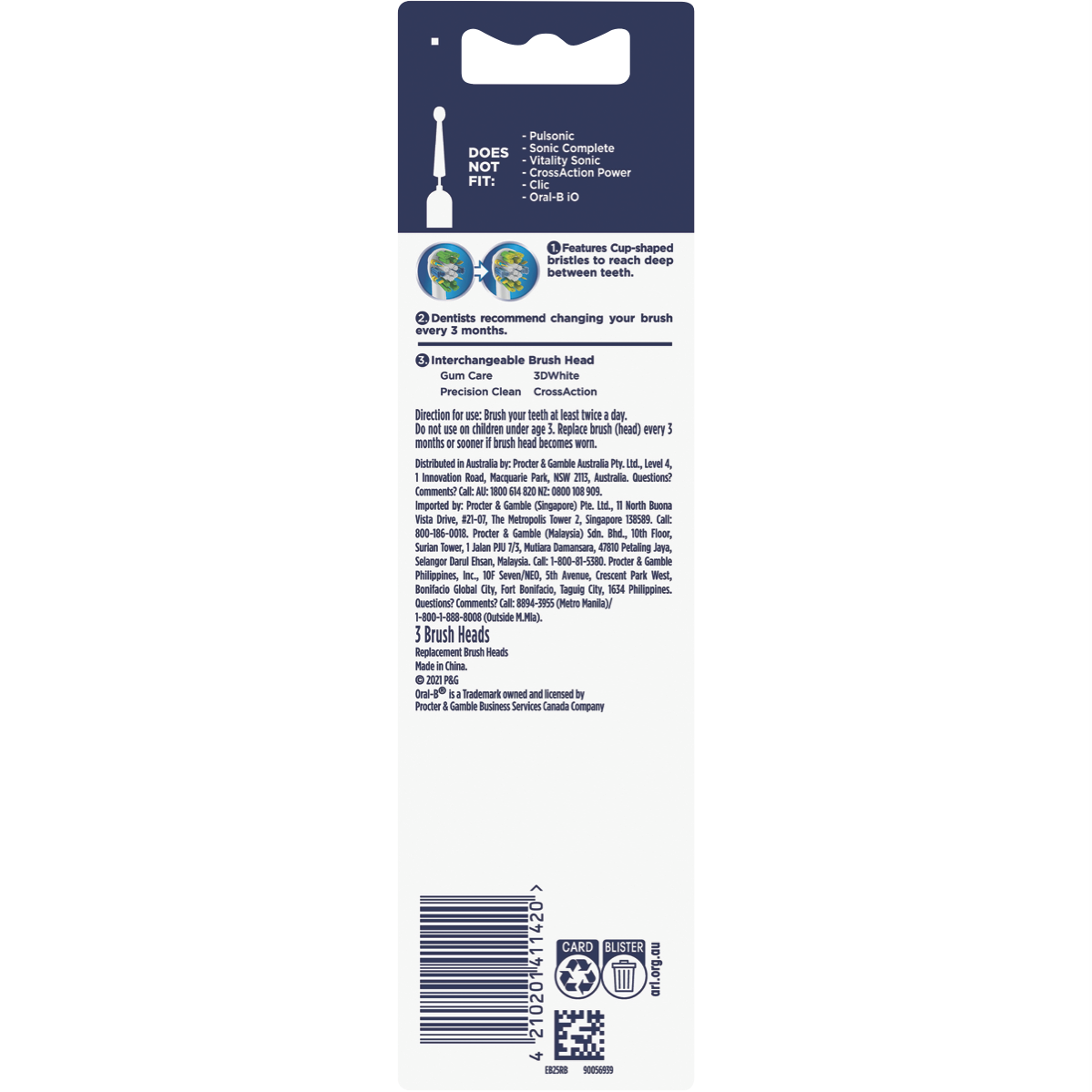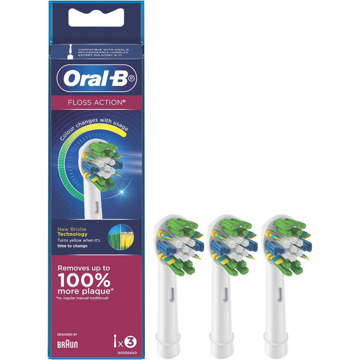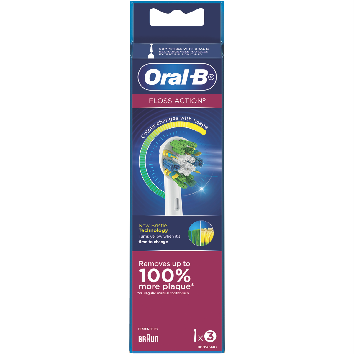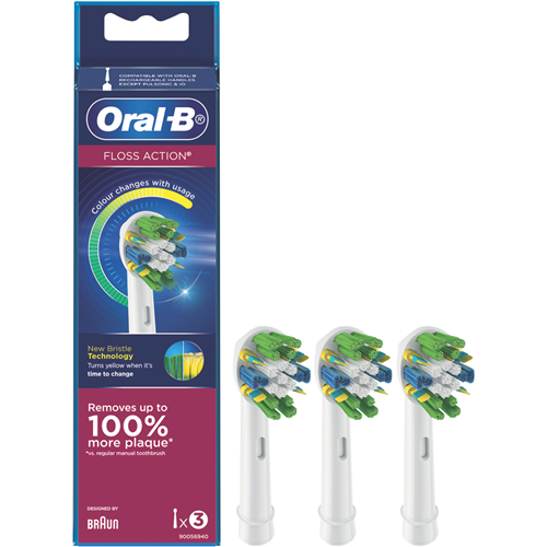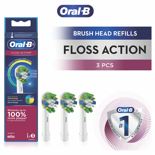 Tidy up your oral care routine with the Oral B Floss Action Replacement Brush Heads 3 Pack. Compatible with most Oral B rechargeable toothbrush handles these replacement brush heads feature oscillating-rotating bristles that remove up to 100% more plaque than a regular manual toothbrush. The floss action bristles deep clean between teeth to gently lift out trapped plaque and debris for a refreshing clean. The bristles turn yellow when it's time to replace your brush head so you know when a refresh is needed. With three replacement heads in each pack you can keep your oral hygiene routine in tip top shape. Give your teeth a thorough clean and enjoy the fresh feeling of a just-brushed smile every day. The manufacturer's part number for this product is VITFAREFILL3PK. Switch out your brush heads regularly for best results.