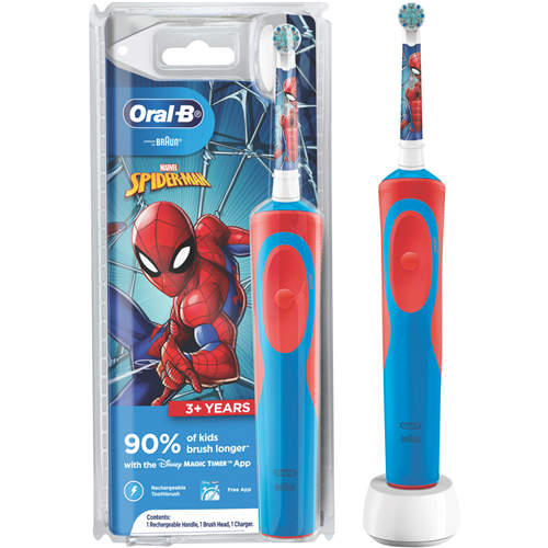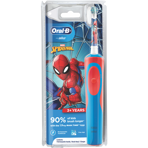 Give your kids' oral health a boost with the Oral B Vitality Kids Spiderman electric toothbrush. This fun Disney-themed brush features a rotating head that surrounds each tooth for a thorough clean. The built-in two-minute timer encourages proper brushing time while the rechargeable battery means no expensive replacements. Kids will love their new Spiderman brush buddy that makes taking care of their teeth fun. Multiple brush heads are included for when it's time to switch ensuring your child always has a fresh effective brush on hand. Teach your kids healthy habits and make brush time entertaining with the Oral B Vitality Kids Spiderman electric toothbrush. The manufacturer's part number for this product is VITALITYKSW. Check it out today!