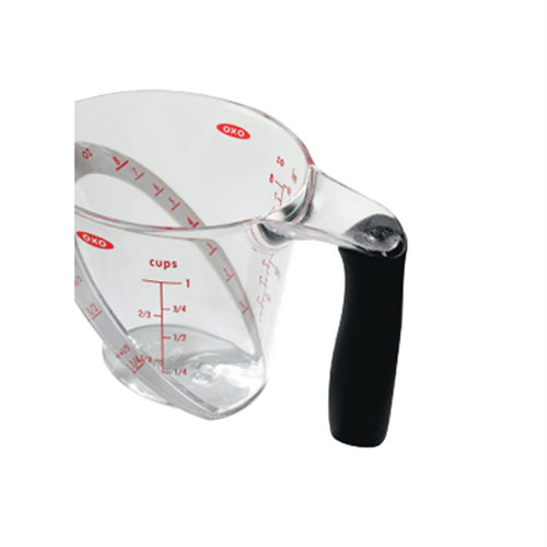 The OXO Good Grips 1 Cup Angled Measuring Cup is a kitchen tool that makes cooking and baking easier. This clear measuring cup has a patented angled surface so you can read measurement markings by looking straight down into the cup. The soft non-slip grip provides comfort while the BPA free plastic ensures safety. With its precise measurements this cup takes the guesswork out of cooking and baking. The angled surface provides an unobstructed view of the measurements making it easy to get accurate amounts of ingredients. The soft grip allows for a comfortable secure hold when portioning out flour sugar oil milk and more. Durable and dishwasher safe this measuring cup will be a kitchen staple for years to come. For hassle-free portioning and measuring choose the OXO Good Grips 1 Cup Angled Measuring Cup. The manufacturer's part number for this product is 48287. Consider adding this handy kitchen tool to your collection.