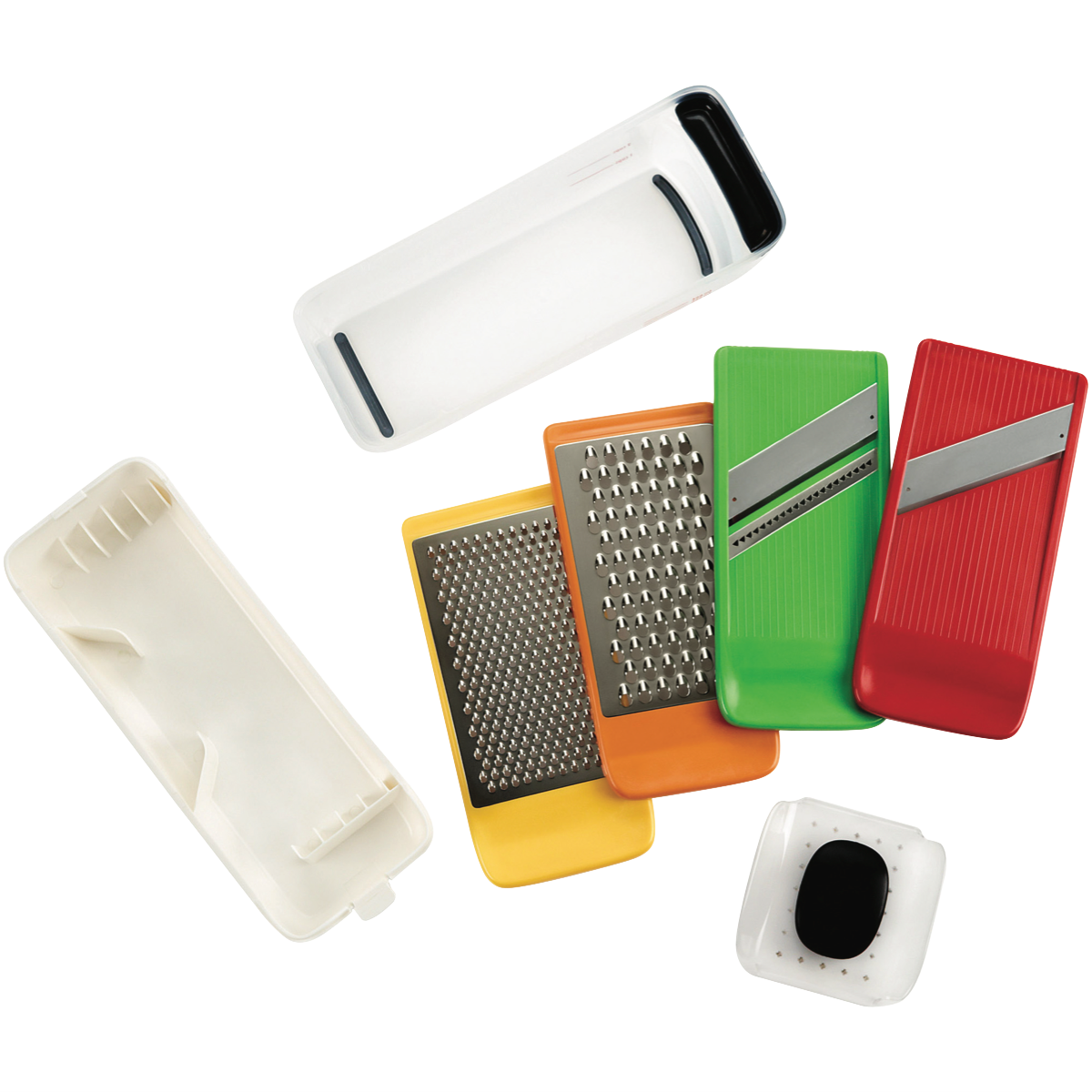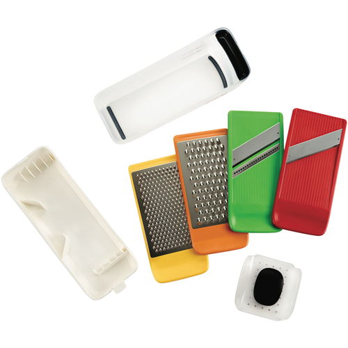 Additional Features Stainless steel, Includes coarse and medium grating and straight and julienne slicing surfaces,, BPA free, Non-slip feet, Soft non-slip grip