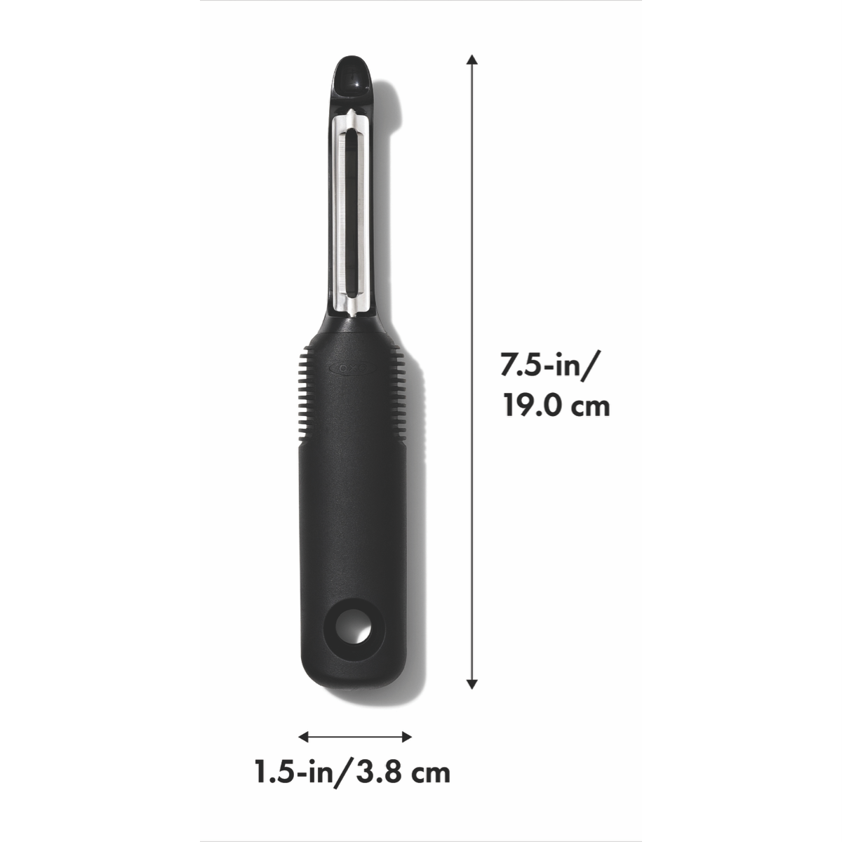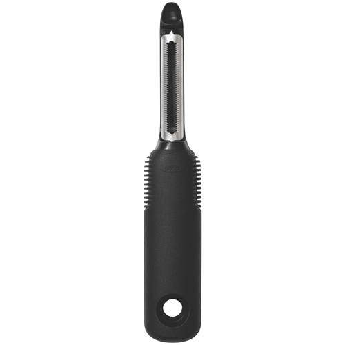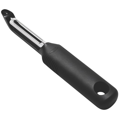 The OXO Good Grips Swivel Peeler is a must-have kitchen tool for effortless peeling. With a soft non-slip grip and hardened stainless steel blade this peeler easily glides through fruits and vegetables to remove skin with precision. The built-in potato eyer is perfect for removing blemishes or eyes from potatoes in one smooth motion. Simplify meal preparation with the OXO peeler's swivel action that follows the contours of produce for consistent results. Durable and dishwasher safe this essential peeler will be your new go-to for creating healthy meals and snacks. The ergonomic handle provides control and reduces hand fatigue while the sharp blade makes quick work of peels. Bring ease and confidence to your kitchen tasks with the OXO Good Grips peeler. Check out this quality kitchen tool to add to your culinary arsenal today. The manufacturer's part number for this product is 48000.