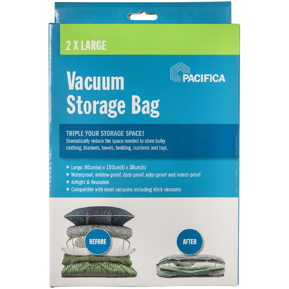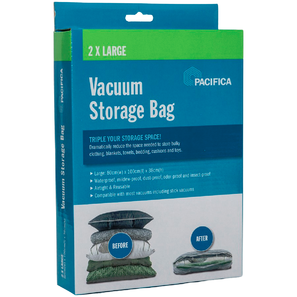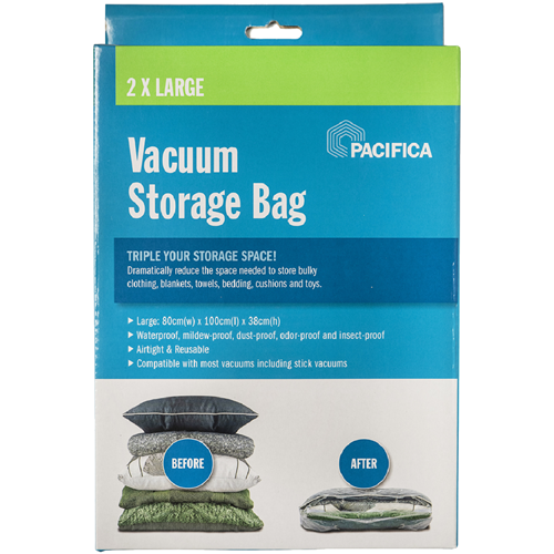 Looking for an easy way to store out-of-season clothing and bedding? The Pacifica Vacuum Storage Bags - Large are the perfect solution. These reusable airtight bags use vacuum compression technology to significantly reduce the space your items take up. Simply place clothes pillows or linens inside attach the vacuum nozzle and suck out the air. You'll be amazed as the bags shrink down to a fraction of their original size. The x2 80w x 38h x 100d cm large bags maximize storage capacity while protecting your belongings from dust moisture and pests. Stop wasting closet space and start getting organized with Pacifica's innovative vacuum storage bags. The manufacturer's part number for this product is VL810. Check them out today for convenient space-saving storage.