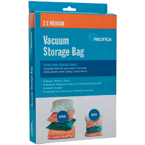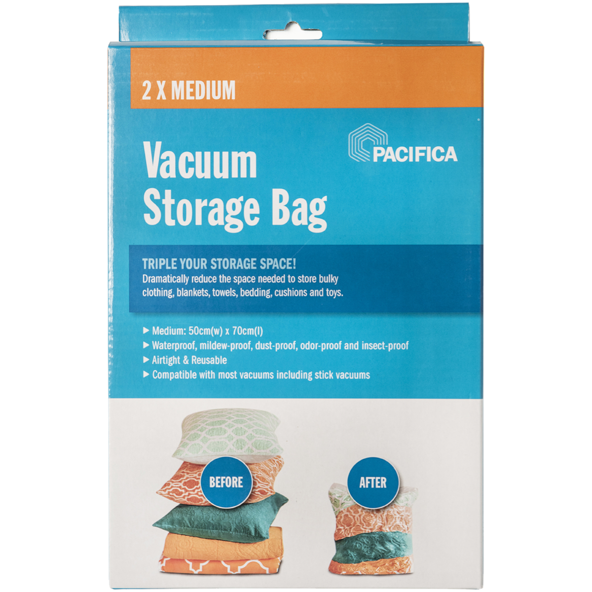 Take control of your laundry storage with the Pacifica Vacuum Storage Bags - Medium. These reusable airtight bags are the perfect solution for compressing and organizing clothes bedding towels and more. With two medium-sized 50cm wide x 70cm length bags you can significantly reduce the space your linens sweaters and other textiles take up. The vacuum seal feature removes air to shrink contents down to half their original size. Simply use your household vacuum to suck out all the air and compress contents down. The airtight seal then keeps contents compressed for space-saving storage. When you need to access items just open the seal and the bag inflates back to normal size. With the Pacifica Vacuum Storage Bags you can maximize closet shelf and underbed space while keeping items protected from dust moisture bugs and more. Declutter your home and make storage a breeze with these innovative laundry and linen organizers. The manufacturer's part number for this product is VM057. Get your home organized with the Pacifica Vacuum Storage Bags today.