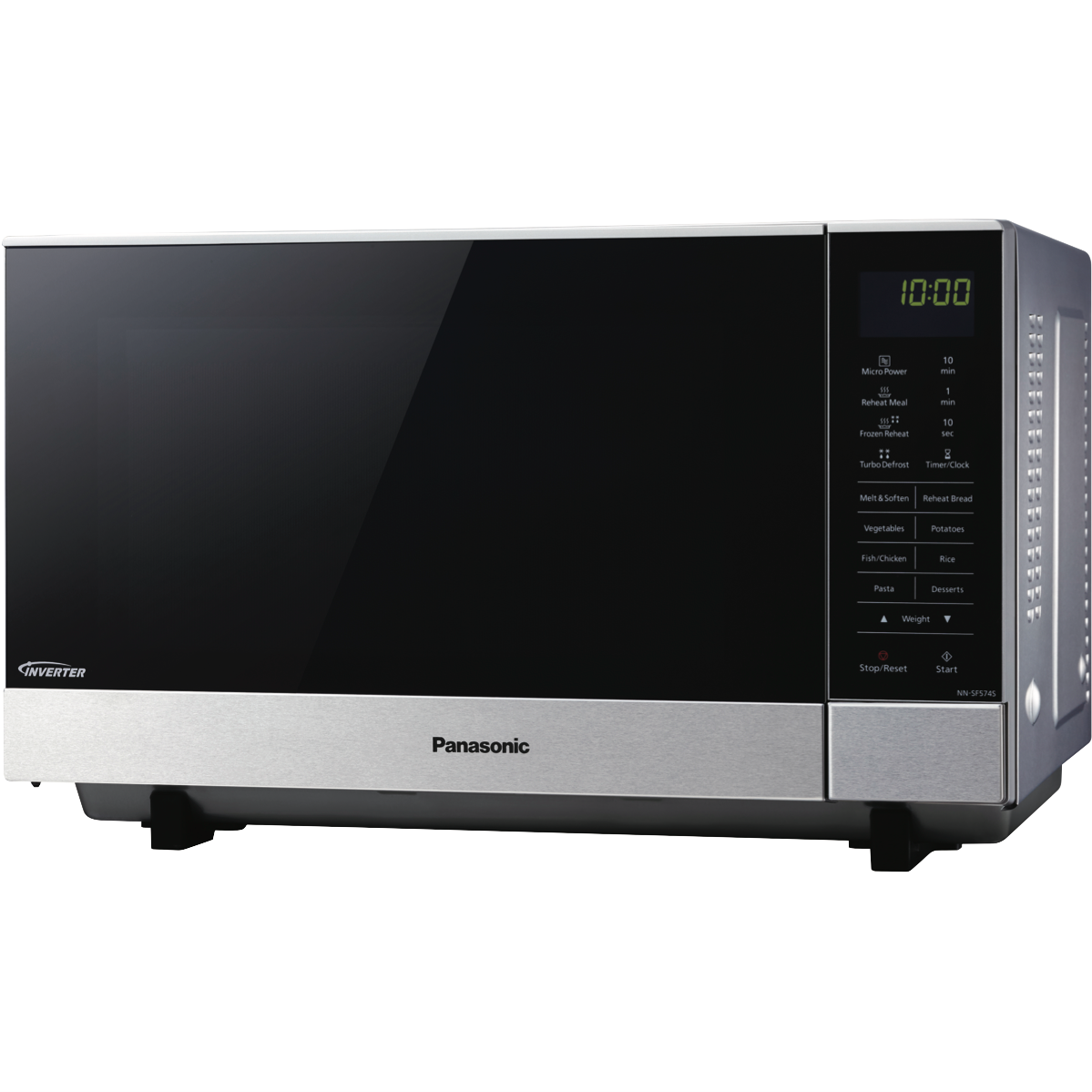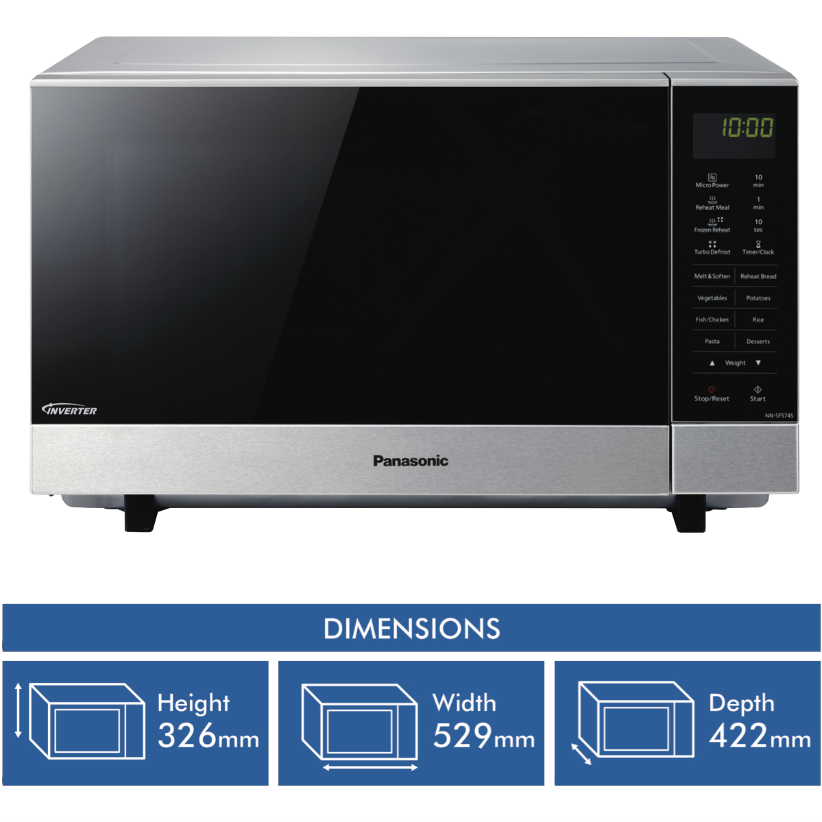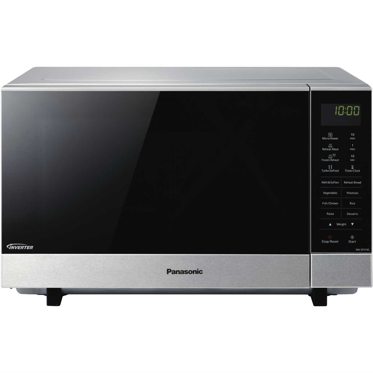 Revolutionize your kitchen with the Panasonic 27L 1000W Flatbed Microwave in sleek stainless steel. This powerful microwave utilizes advanced Inverter technology to evenly reheat and defrost food. The spacious 27L flatbed design fits more inside and makes cleaning a breeze. Convenient touch controls provide one-touch access to auto cook reheat and defrost functions. Turbo defrost and 6 power levels handle everything from frozen foods to simmering stews. The LED light illuminates the interior so you can easily see inside. Additional highlights include a child safety lock quick 30sec button and timer. With 1000W of power this microwave delivers fast even heating for delicious results every time. The durable stainless steel finish resists fingerprints and blends seamlessly into any modern kitchen. Experience gourmet cooking with the versatility of the Panasonic Flatbed. This microwave comes with a 1 year manufacturer's warranty for peace of mind. The manufacturer's part number for this product is NN-SF574SQPQ.