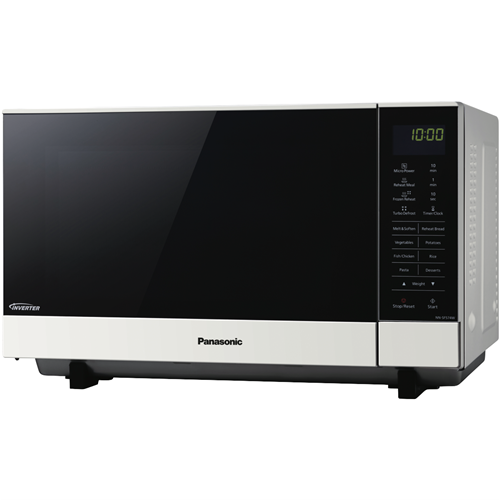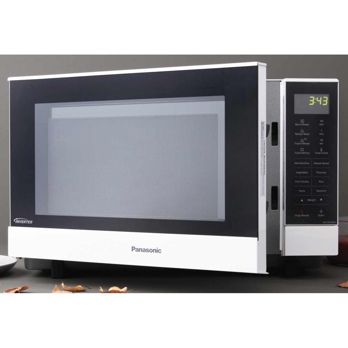 Sleek and spacious the Panasonic 27L 1000W Flatbed Microwave in crisp white is your kitchen's new necessity. Evenly cook reheat and defrost with Panasonic Inverter Technology. The wide flatbed design fits more inside and makes cleaning effortless. Check on cooking progress under the handy LED light. Auto Cook Reheat Meal Turbo Defrost and Frozen Reheat functions remove the guesswork from microwave mastery. With 6 adjustable power levels touch control panel and a generous 27 litre capacity you'll breeze through food prep. Measuring 52.9cm wide 32.6cm high and 42.2cm deep it fits most kitchen spaces. The manufacturer's part number for this product is NN-SF564WQPQ. Bring convenient cooking and easy cleaning home with the Panasonic 27L Flatbed Microwave.
