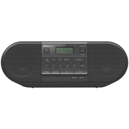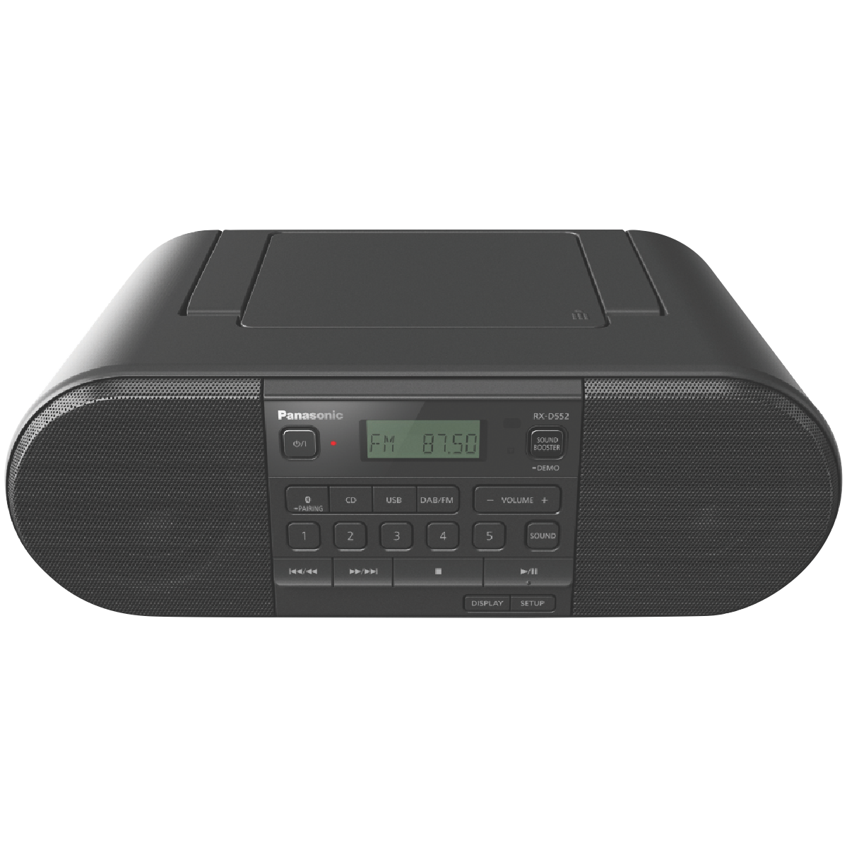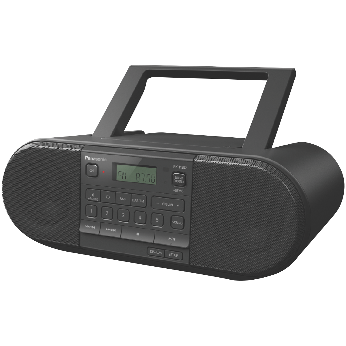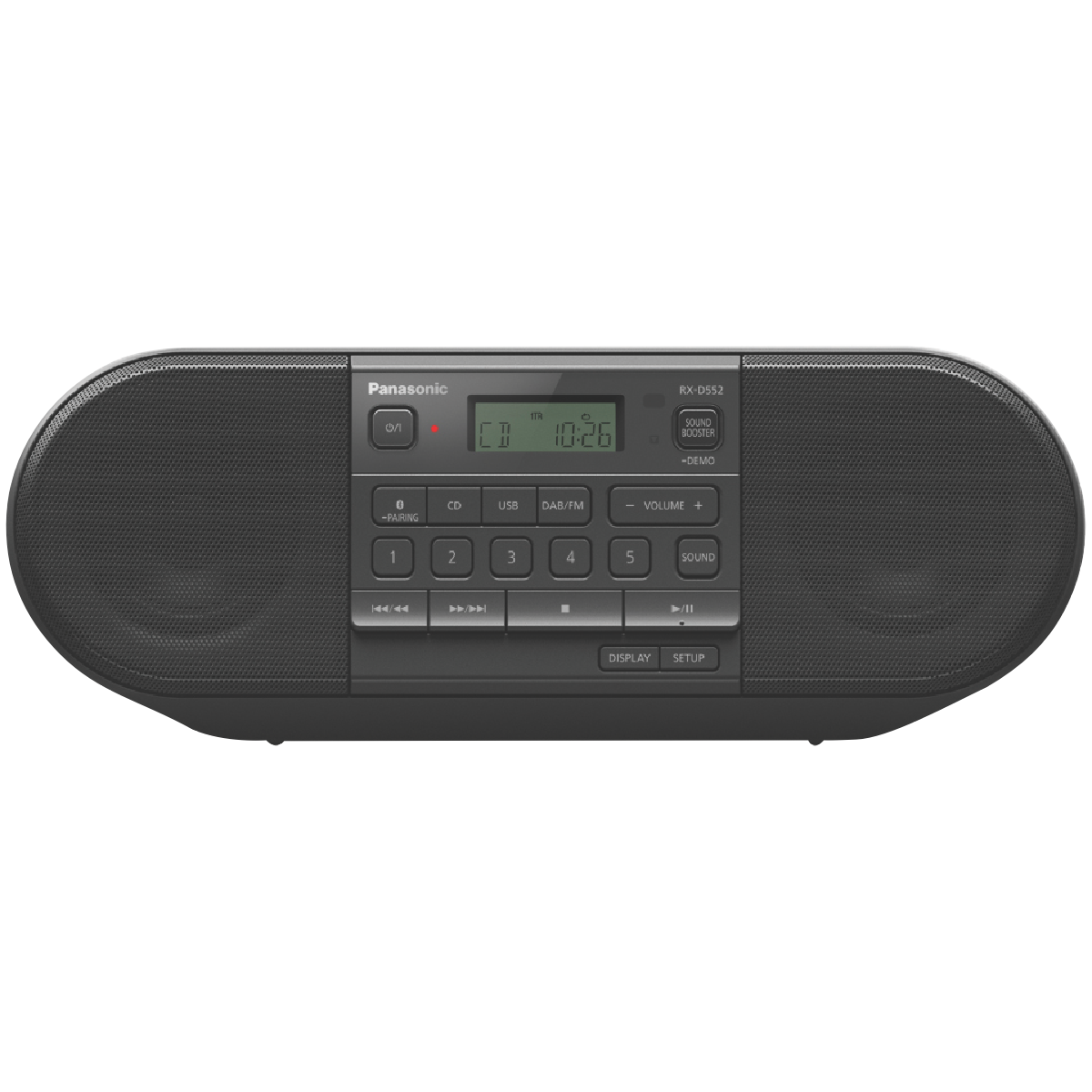 The Panasonic RX-D552GN-K is DAB+ Boombox with CD Player and Bluetooth streaming. It features 20W of power and compact sleek design. Bass performance is enhanced with Sound Booster and bass reflex ports making it equally suited indoors or in the garden or garage. You can choose music from DAB+ radio play CDs stream from your mobile with Bluetooth or pick tracks direct from USB. With a remote control and 5 radio preset buttons listening to your favourite tunes is a breeze. Thanks to an integrated carrying handle a stylish compact form and the ability to take batteries this unit is equally beneficial at home indoors or out. Its powerful rich sound makes it the perfect partner in the garden garage kitchen or study.