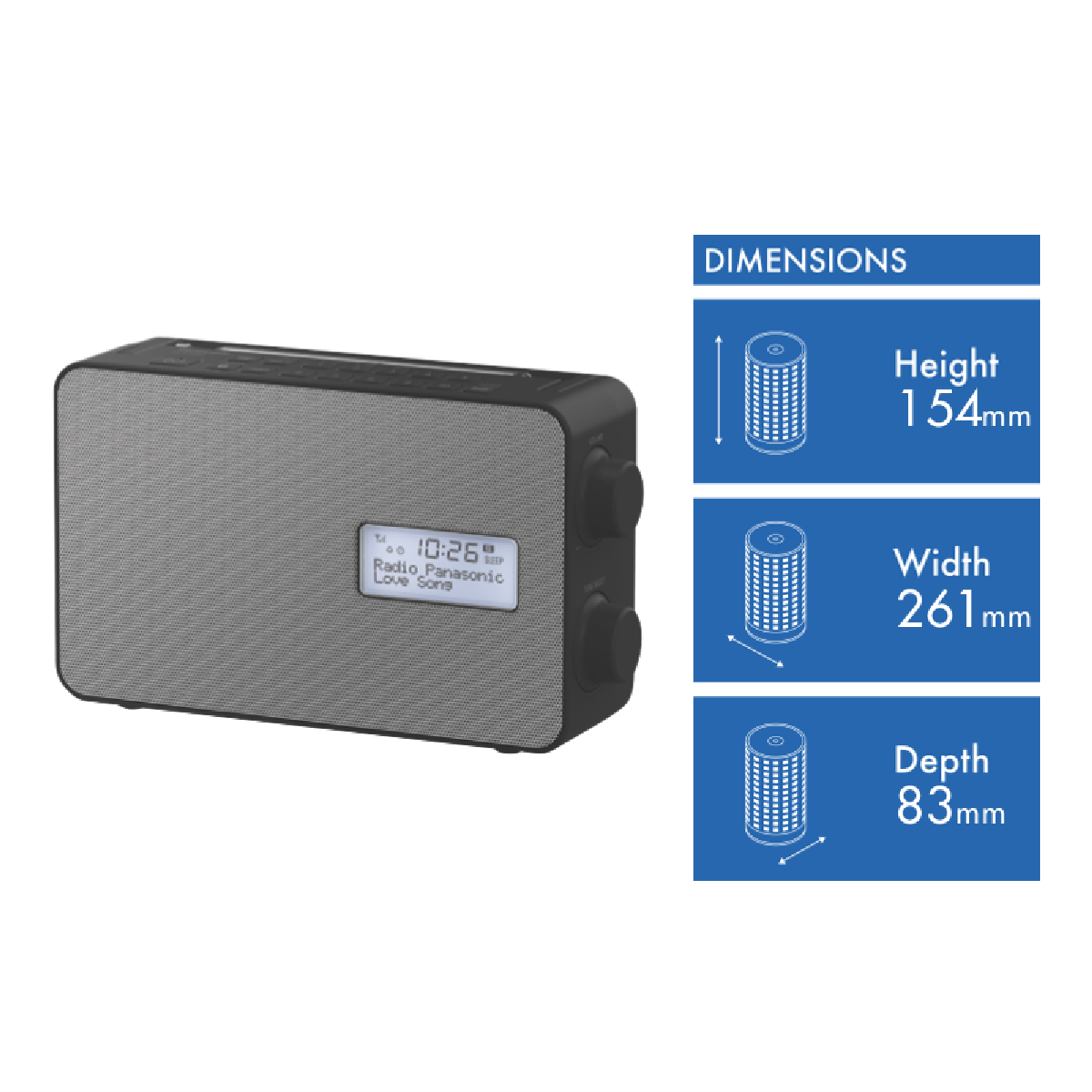 Escape the daily grind with the Panasonic DAB+ FM & Bluetooth Portable Radio. This compact digital radio delivers clear room-filling sound from its 10cm full-range speaker. With DAB+ digital and FM radio bands you'll always find a station to suit your mood. Connect via Bluetooth to stream music wirelessly from your smartphone or tablet. With 10 preset stations and a backlit LCD display listening is easy and enjoyable. The built-in alarm timer lets you wake up to your favorite station or tone. Powered by 4x C batteries for up to 20 hours of portable listening. Weighing just 1.3kg the Panasonic DAB+ FM radio is the perfect companion at home in the office or on weekends away. Enjoy reliable reception and bold balanced audio wherever you go. The manufacturer's part number for this product is RF-D30BTGN-K. Bring your favorite stations with you on the go with the Panasonic Portable DAB+ FM Radio today.