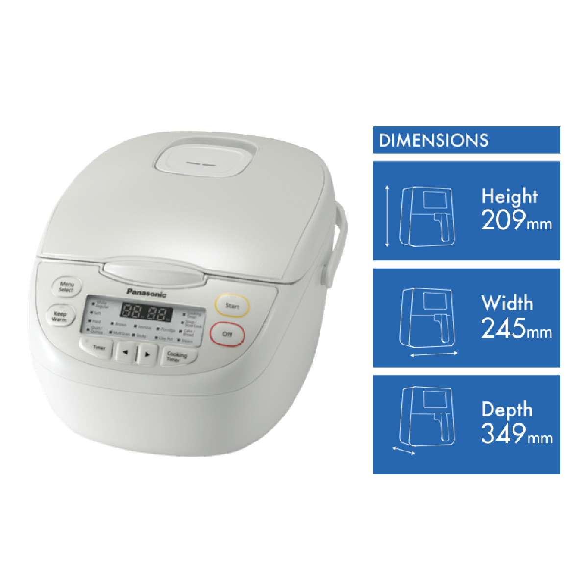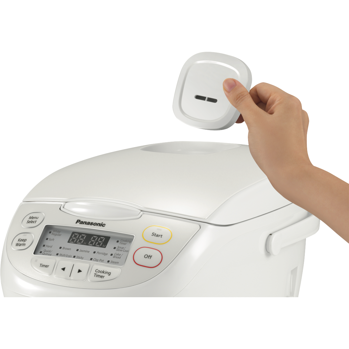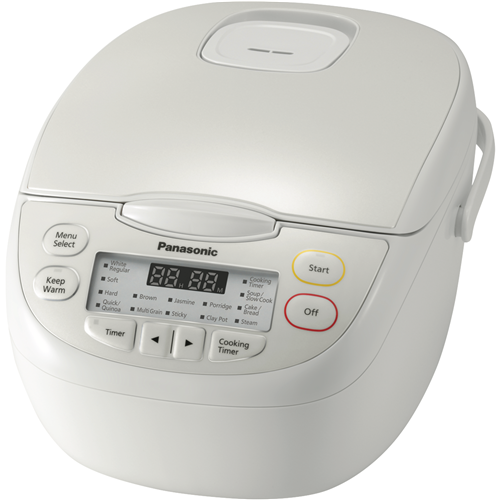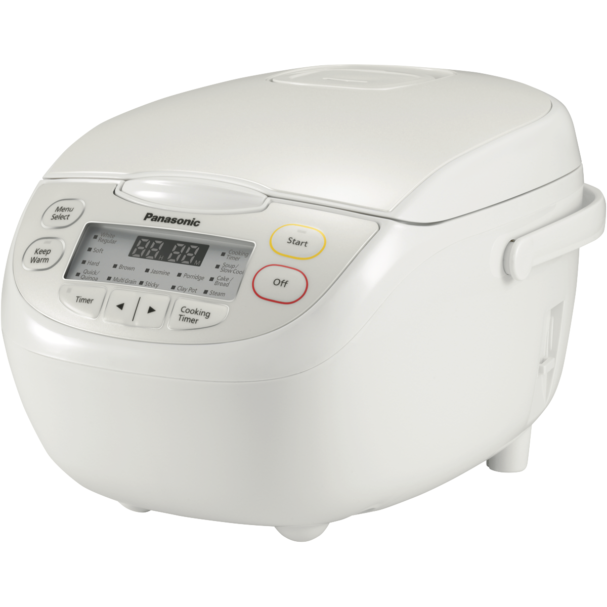 Enjoy perfectly cooked fluffy rice and so much more with the versatile Panasonic Deluxe 5 Cup Rice Cooker. This multi-talented appliance features 16 menu programs to cook a variety of grains beyond just rice including quick cooking brown multi-grain porridge clay pot and more. The non-stick inner pot with durable 2.2mm coating ensures an easy cleanup every time. With specialized functions for steaming slow cooking baking and keeping food warm for up to 12 hours this rice cooker truly does it all. The convenient control panel and delay timer allow you to start cooking with the touch of a button even when you're not in the kitchen. Cook for the whole family with the generous 5 cup capacity. The steam vent and detachable lid add extra convenience. For reliably delicious grains and one-pot meals made easy bring home the Panasonic Deluxe 5 Cup Rice Cooker today. The manufacturer's part number for this product is SR-CN108WST.