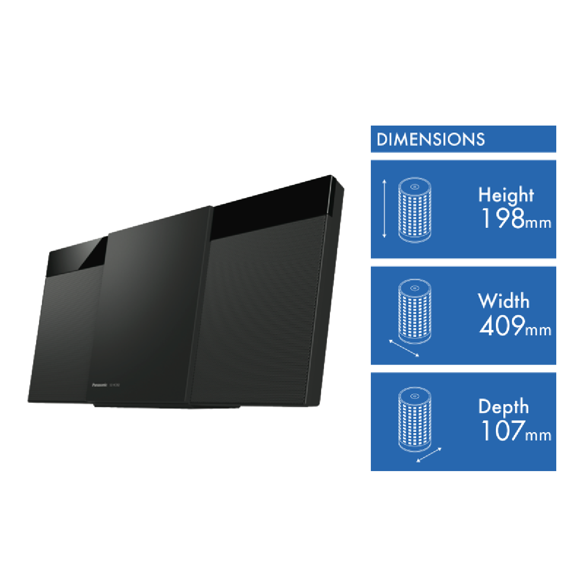 Step into a world of pure rich sound with the Panasonic Slim Stylish Compact Micro System. This sleek all-in-one entertainment hub brings the concert to your living room with 20W of dynamic audio power. Jam out to vinyl CDs or digital tunes via Bluetooth USB or old-school radio. With a stylish space-saving design this mini music system fits perfectly on your shelf desk or tabletop. Enjoy room-filling audio from the Bass Reflex speaker system. Dial into crystal clear DAB+ digital radio or FM with easy presets. Connect your smartphone or tablet wirelessly and take control with the included remote. With modern connectivity and vintage vibes this micro system from Panasonic is the perfect audio upgrade for your home. The manufacturer's part number for this product is SC-HC302GN-K. Bring home bold balanced sound today with the Panasonic Slim Stylish Compact Micro System.