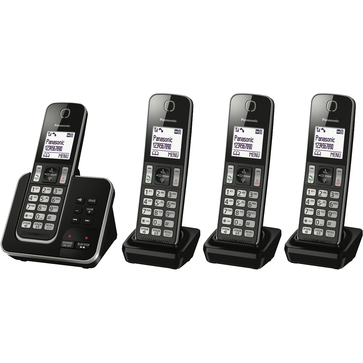 Stay connected with crystal clear calls across your home with the Panasonic Quad Pack Cordless Phone. This versatile phone system features four handsets that provide up to 16 hours of talk time and 200 hours on standby so you'll always be ready for the next call. The large phonebook stores up to 120 contacts while the backlit display and easy-to-use interface makes dialing effortless. With noise reduction technology and DECT 6.0 digital transmission conversations come through loud and clear every time. Caller ID allows you to see who's calling before you pick up. Customize your ringtones with polyphonic tones to match your style. Expandable up to 6 handsets (additional handsets sold separately) this system enables convenient communication across every room. The Panasonic Quad Pack Cordless Phone keeps your household connected. The manufacturer's part number for this product is KX-TGD324ALB.