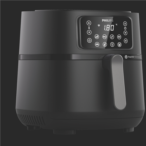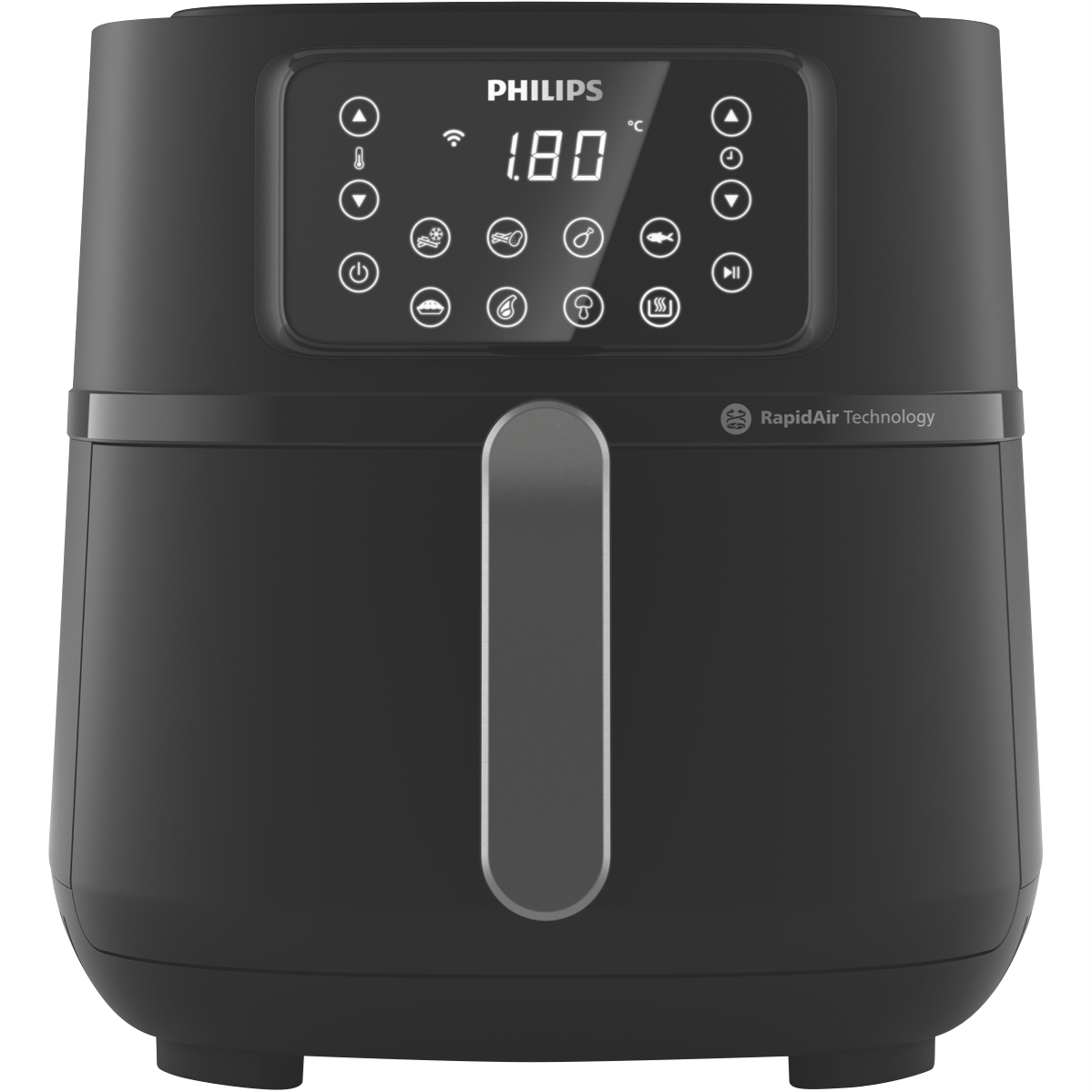 The Philips Air Fryer XXL 5000 Series is set to transform your kitchen into a healthy haven. With a generous 7.2L capacity this sleek black and silver air fryer allows you to cook family-sized portions of your favourite fried foods with up to 90% less fat. Using Rapid Air technology and a powerful 2000W element it circulates hot air around your food to create that iconic crispy finish you love. Whether you're frying roasting grilling baking or even dehydrating you'll get delicious results every time thanks to smart features like the integrated NutriU app with over 200 pre-set recipes. The intuitive touch screen gives you precise control over time and temperature while the non-stick coated drawer and dishwasher safe parts make cleanup a breeze. With multiple built-in cooking functions this versatile Philips air fryer eliminates the guilt without sacrificing taste. Convenient automatic shut off provides added peace of mind. Create healthier versions of fried chicken chips and more with the Philips Air Fryer XXL 5000 Series. The manufacturer's part number for this product is HD9285/90. Check out this innovative air fryer today for tasty low-fat cooking.