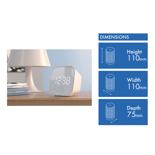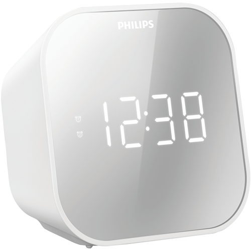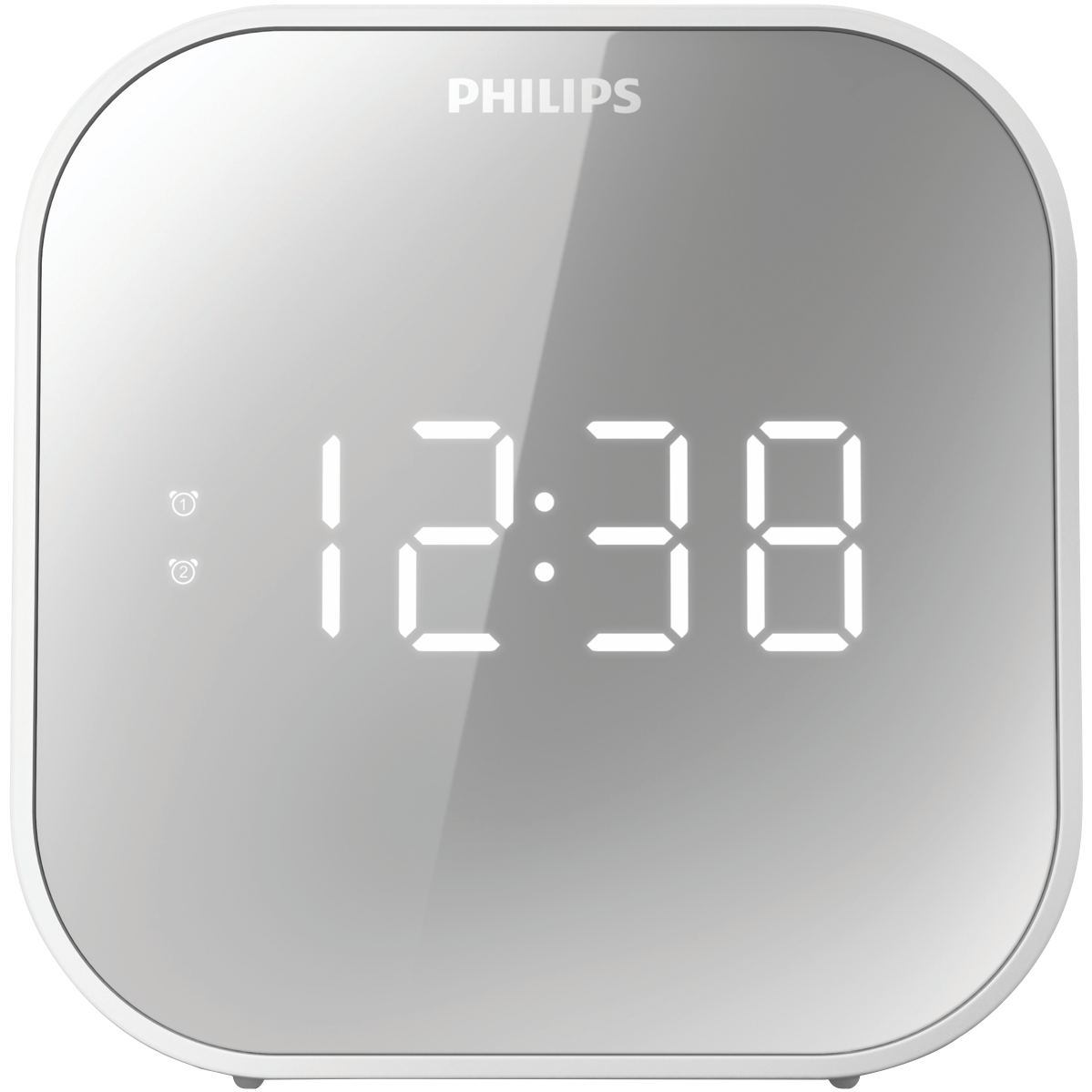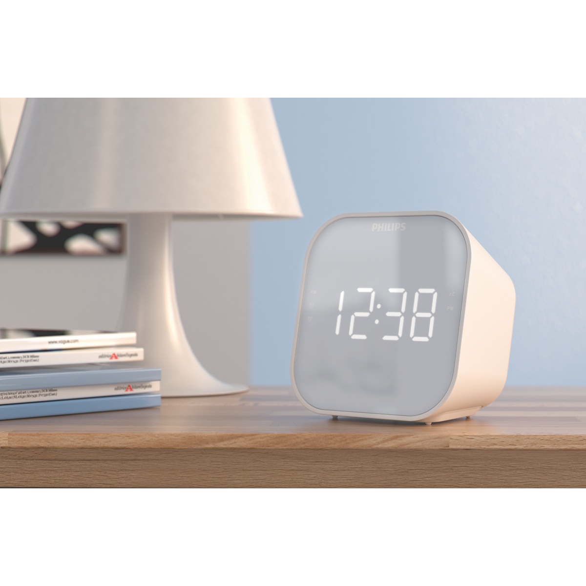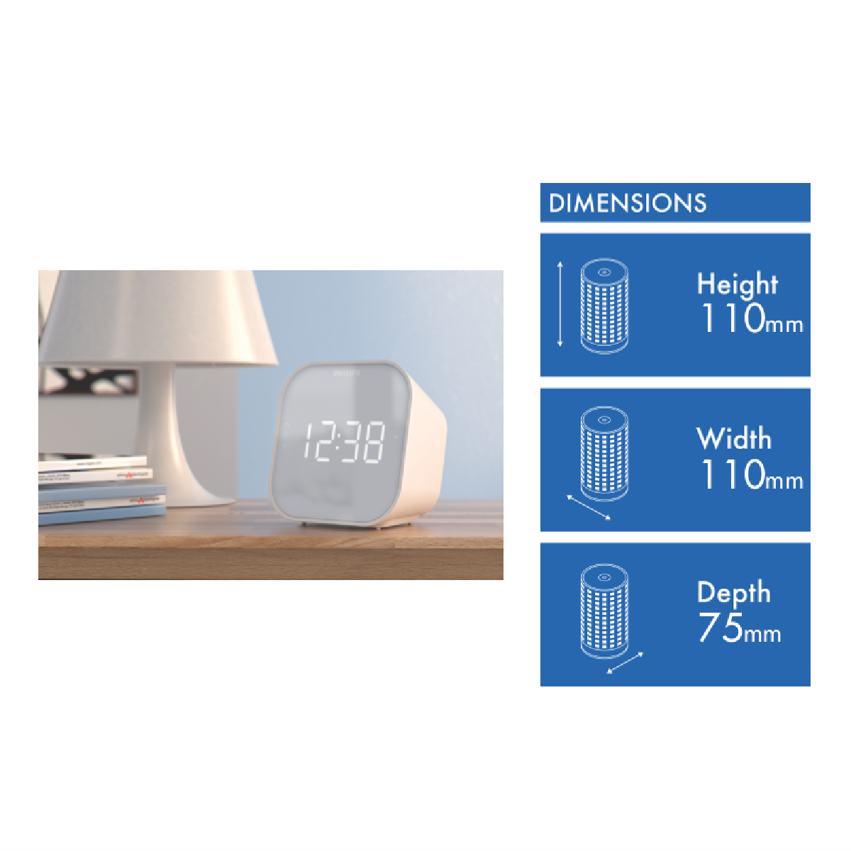 Wake up refreshed and on time with the Philips Alarm Clock with USB Charging. This LED clock radio features dual alarms gentle wake technology and 20 station presets to start your day right. Charge your phone or tablet via the convenient USB port while you sleep. With a sleek compact design and easy-to-read display this clock radio looks great on a nightstand or desk. The back up battery ensures you won't miss an alarm during a power outage. Measuring just 110mm x 110mm x 75mm and weighing only 0.22kg this alarm clock is the perfect size for tight spaces. Never oversleep again with the reliable Philips Alarm Clock. The manufacturer's part number for this product is TAR4406/79. Check out this clock radio's features and benefits today.