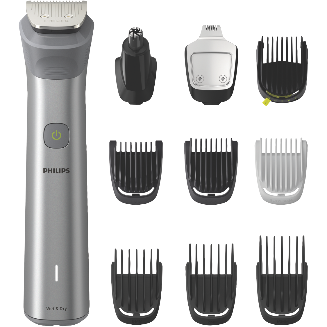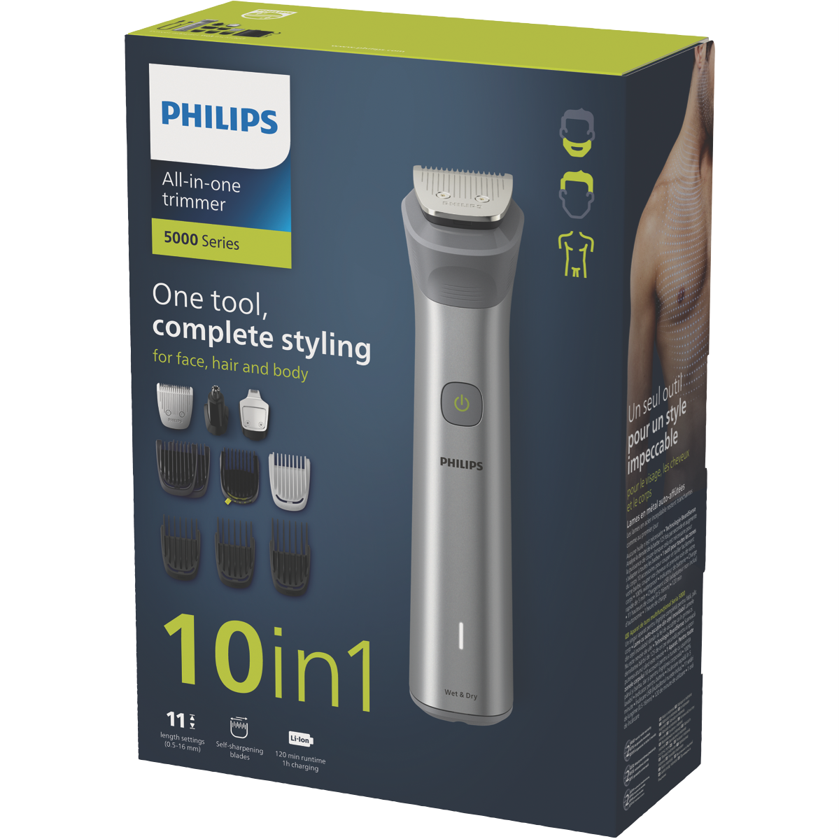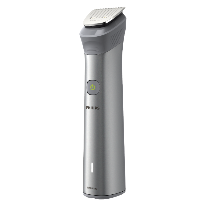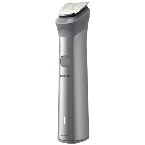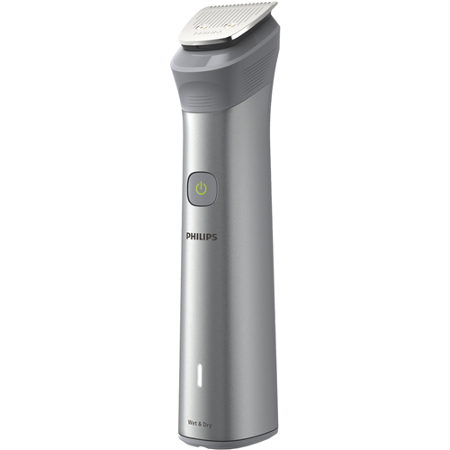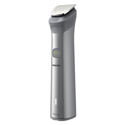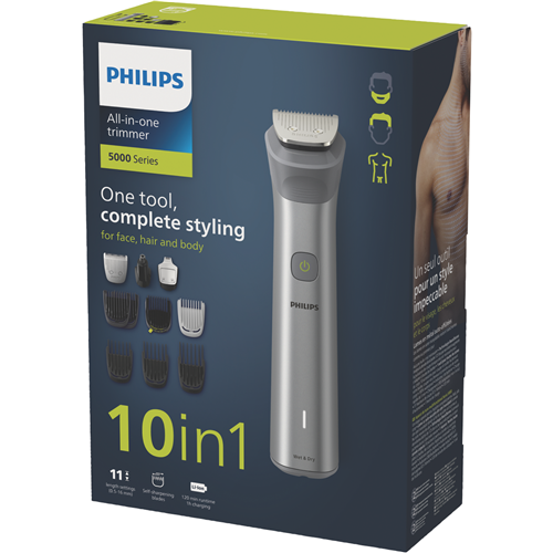 The Philips All In One Series 5000 Multi Groomer is the ultimate grooming tool for men who want it all. With 10 attachments this electric shaver tackles beards body hair nose and ear hair leaving you looking neat and tidy. The lithium-ion battery provides up to 120 minutes of cordless use with only a 5 minute charge. The precision trimmer scans your beard 125 times per second automatically adjusting power for optimal trimming on any length or thickness of facial hair. The rubber grip ensures total control as you trim wet or dry in the shower. Multiple length combs and a detail trimmer allow you to maintain facial styles with ease. The stainless steel self-sharpening blades stay sharp as the day you bought them delivering a close shave every time. This groomer comes with a cleaning brush soft pouch for storage and travel and a 2 year warranty for peace of mind. Achieve the look you want with the versatile Philips All In One Series 5000 Multi Groomer. The manufacturer's part number for this product is MG5920/15.