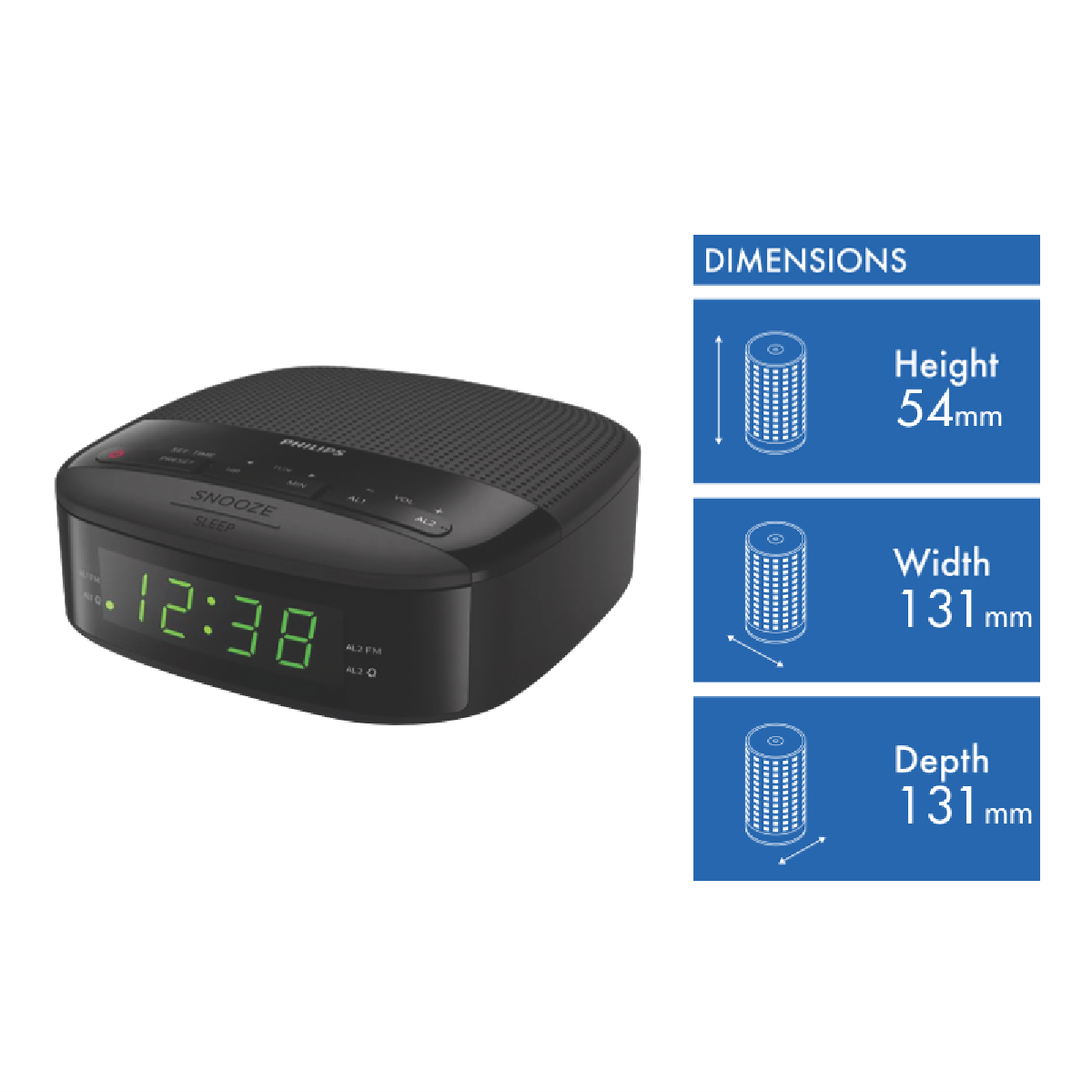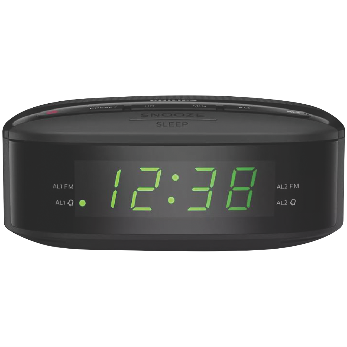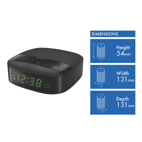 Wake up refreshed with the Philips Clock Radio. This sleek black radio alarm clock features a bright LED display and 10 station presets so you can easily tune in to your favorite FM radio stations between 87.5 to 108 MHz. The full range 2 speaker delivers crisp clear sound to start your day right. Set the dual alarm to wake you at your desired time. Or use the battery backup to maintain alarm settings in case of power interruption. With a compact design and easy-to-use controls the Philips Clock Radio seamlessly fits on nightstands and shelves in bedrooms and kitchens. Keep track of time and enjoy your favorite radio programs with this versatile clock radio. Stay on schedule and wake up on time with help from the convenient Philips alarm clock. The manufacturer's part number for this product is TAR3205/98. Add this reliable radio alarm to your cart today.