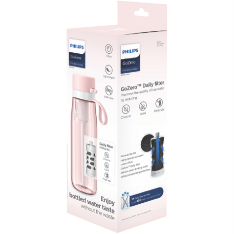 Refresh your daily hydration routine with the Philips Go Zero Daily Straw Filtration. This innovative filtered water bottle with a daily filter provides you with up to 150L of fresh clean water on-the-go. The compact design features a 600ml capacity and convenient straw making it perfect for carrying in your bag. The BPA-free Tritan material is durable dust proof leak proof and even dishwasher safe for easy cleaning. With the Philips filter you can enjoy water free from chlorine and other impurities during your busy day. The daily filter is simple to use - just replace it each day for a continuous supply of filtered water. Stay hydrated and healthy with the Philips Go Zero bottle complete with a 2 year manufacturer's warranty. The manufacturer's part number for this product is AWP2731PKR/79. Check out this filtered water bottle to refresh your daily hydration.