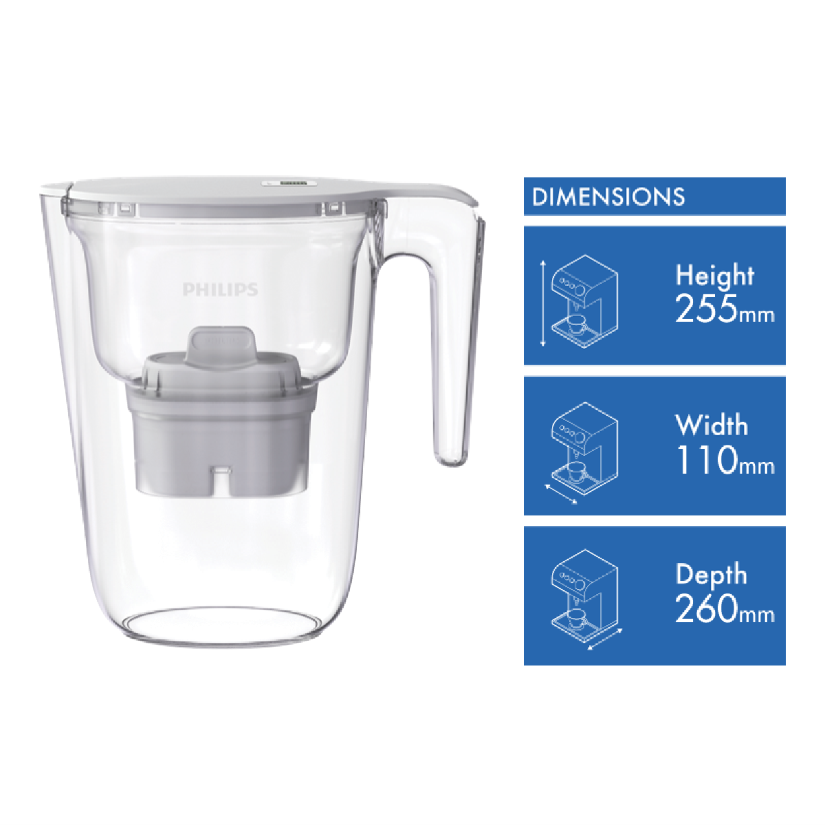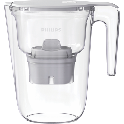 Bring the perfect balance of style and functionality into your kitchen with the Philips Medium 2.6 Litre Water Filter Jug. This bright white filtered water jug features a sleek flip-top lid and battery operated timer for effortless filtered water on demand. The Micro X-Clean filter removes chlorine and other impurities delivering cleaner better tasting water straight from the tap. With a generous 2.6 litre filtered water capacity and compact 260mm diameter 110mm width and 255mm height this jug is ideal for families who want purified water without taking up excessive bench space. The 2 year manufacturer's warranty provides added peace of mind. Experience the difference filtered water can make - upgrade your daily hydration with the Philips Medium 2.6 Litre Water Filter Jug today. The manufacturer's part number for this product is AWP2933WHT/79.