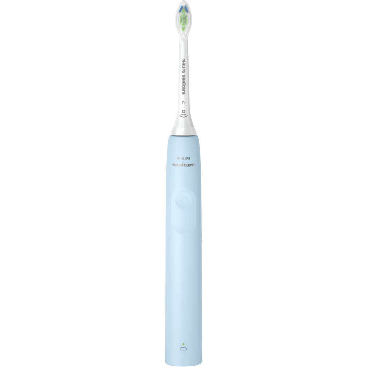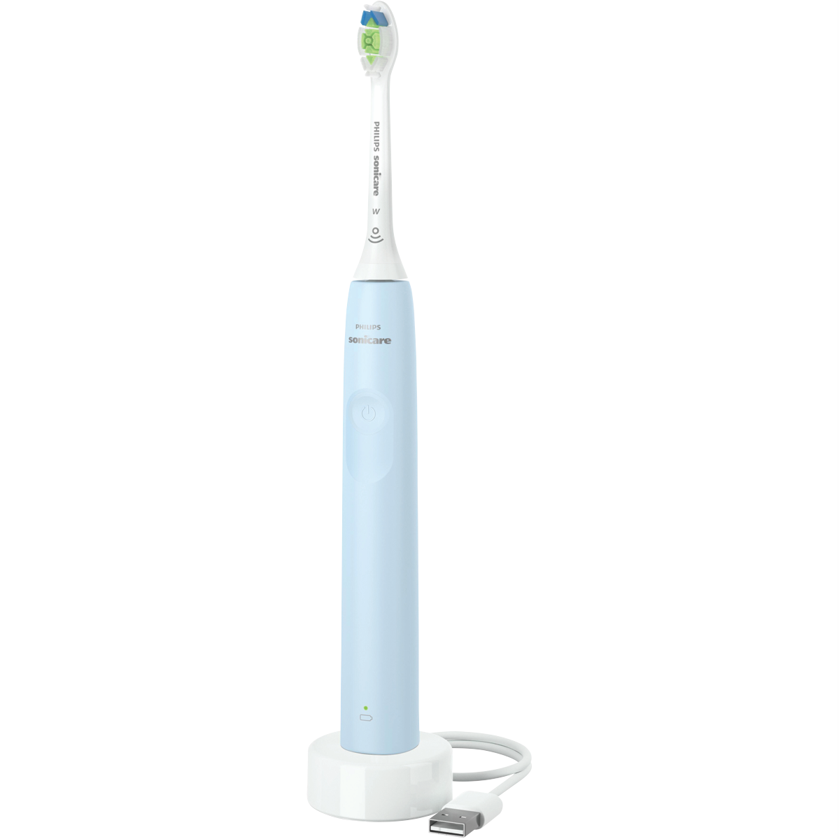 Transform your oral care routine with the Philips Sonicare 2000 Series Electric Toothbrush in light blue. Featuring advanced sonic technology this rechargeable electric toothbrush removes up to 3 times more plaque than a manual toothbrush for whiter healthier teeth and gums. With a slim ergonomic handle and click-on brush heads it provides a comfortable grip for easy maneuvering. The built-in 2 minute timer with 30 second intervals ensures you brush thoroughly. And the lithium ion battery lasts up to 14 days on a single charge. Additional handy features include a battery indicator light to monitor charging status and a travel case for portability. Backed by Philips' 2 year warranty this electric toothbrush delivers exceptional cleaning and convenience. Experience the difference of a deeper clean with the Philips Sonicare 2000 Series. The manufacturer's part number for this product is HX3651/32. Give your teeth the care they deserve and order today.