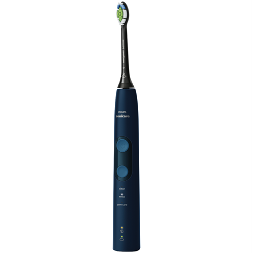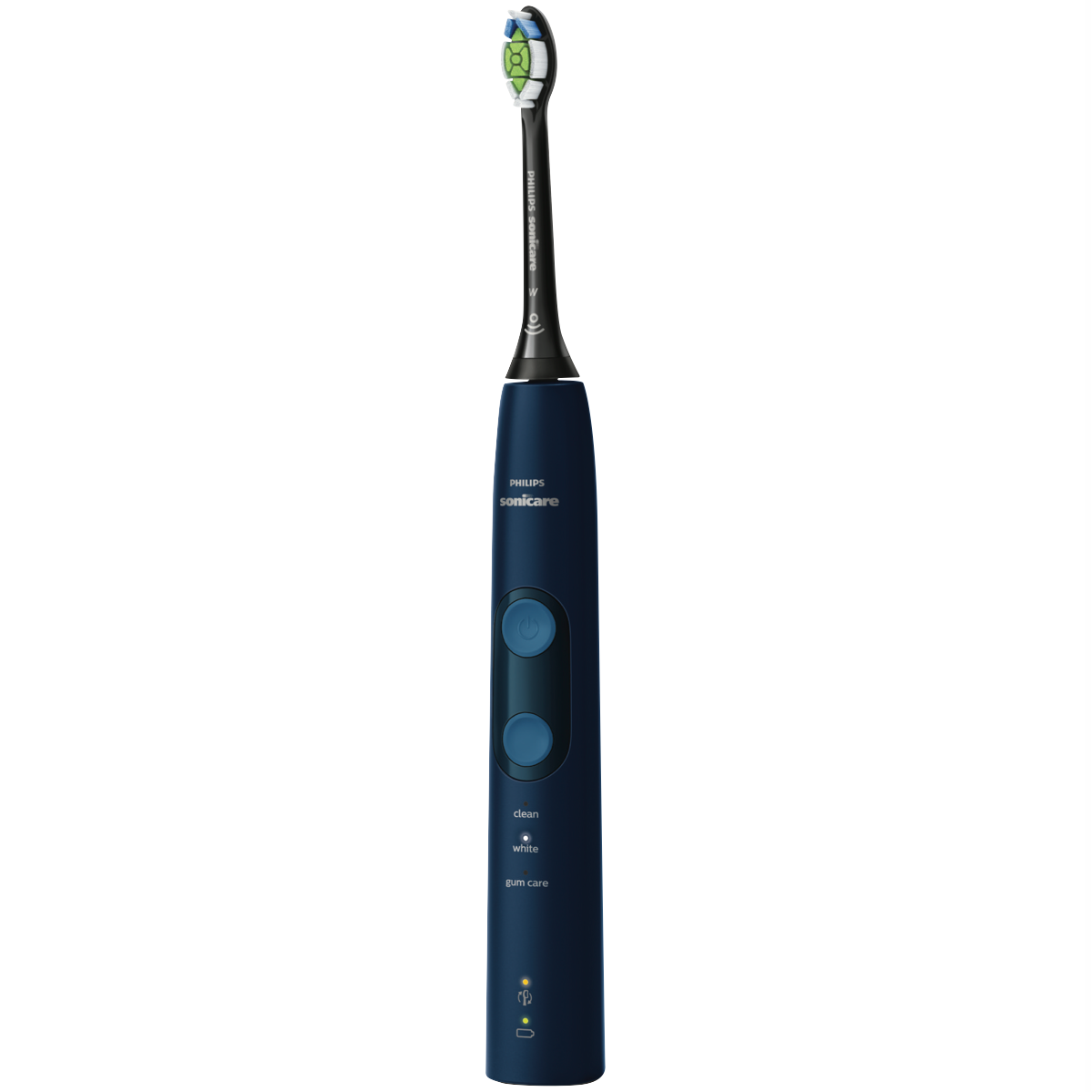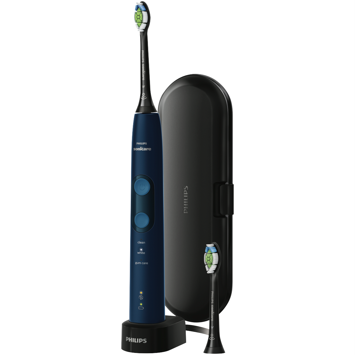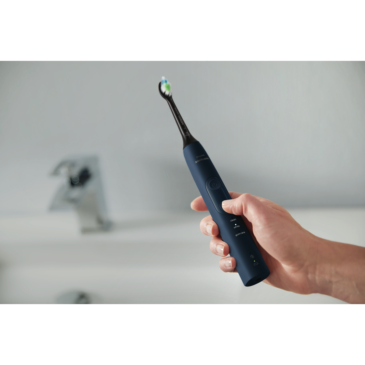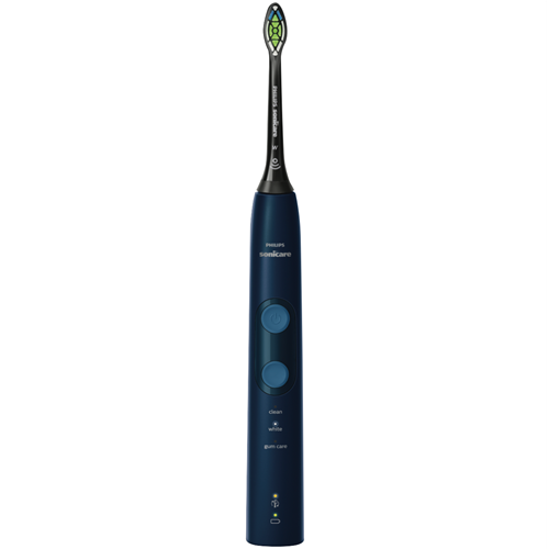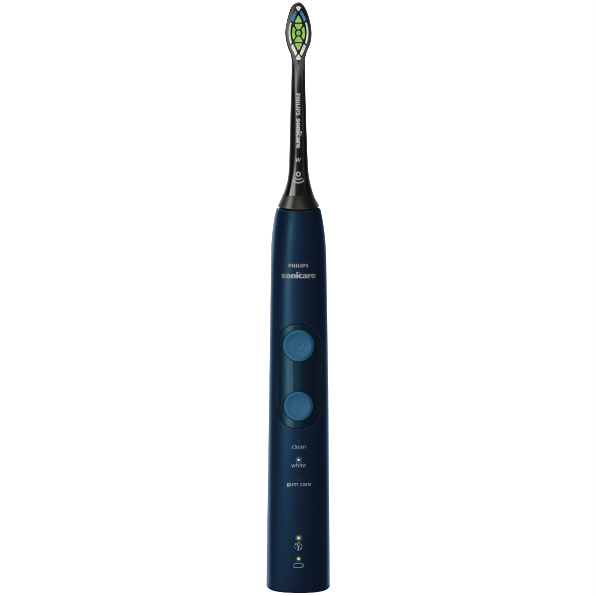 Achieve a brighter whiter smile and healthier gums with the Philips ProtectiveClean 5100 Whitening electric toothbrush. This navy blue toothbrush not only cleans your teeth thoroughly but also gently whitens and polishes them. The built-in two minute timer ensures you brush for the dentist-recommended time while the Clean Gum Care and White modes let you customize your brushing experience. The pressure sensor alerts you when you're brushing too hard helping protect your teeth and gums. Powered by a rechargeable lithium ion battery this toothbrush can go up to two weeks between charges. The battery indicator light shows you when it's time to recharge. With a two year manufacturer's warranty this electric toothbrush comes with a charger two brush heads a handle and a handy travel case so you can maintain your oral health routine while on the go. Give your teeth the gentle yet effective care they deserve with the Philips ProtectiveClean 5100 Whitening electric toothbrush. The manufacturer's part number for this product is HX6851/56. Take a step towards better oral health today.