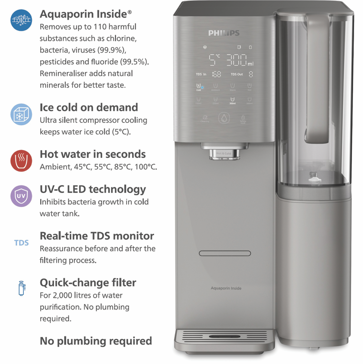Additional Features 2 x 1.8L water jugs, Multiple temperatures available: chilled, ambient, 45%26#176;, 55%26#176;, 85%26#176;, 100%26#176;C, UV-C LED technology in the cold water tank activates every hour, Real-time water quality display presents the amount of Total Dissolved Solids (TDS), Mineral