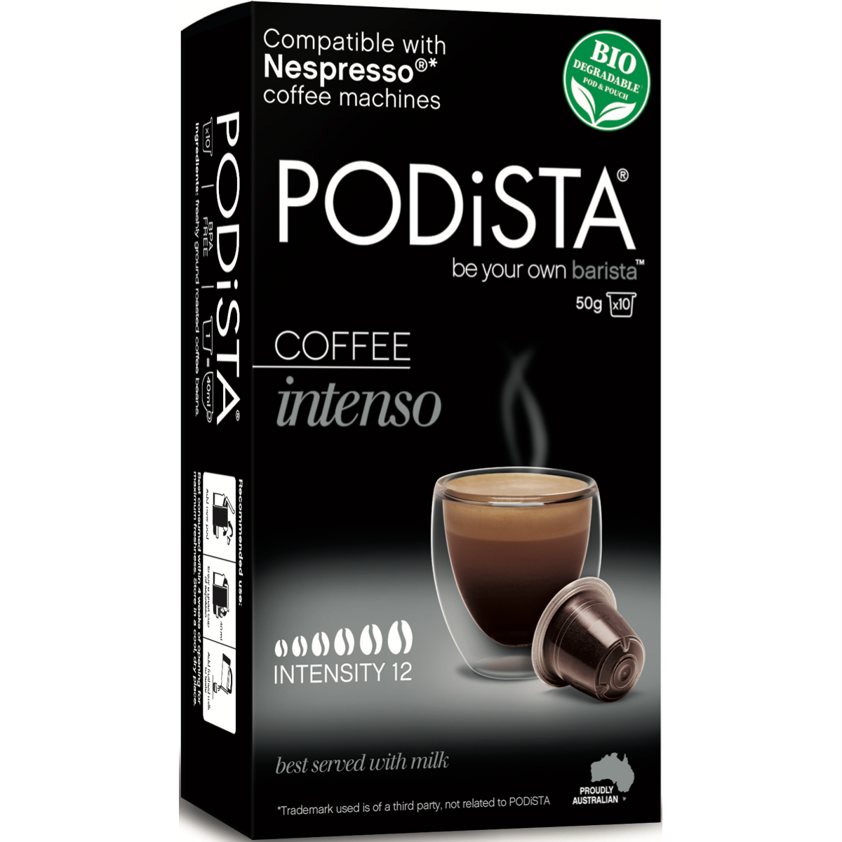 Wake up to the rich intense flavor of Podista Intenso coffee with this 10 pack of coffee pods. These single-serve pods are compatible with Nespresso machines delivering a strong bold coffee experience in seconds. The Intenso blend combines high-quality Arabica beans from Central and South America for a sophisticated flavor profile with subtle hints of roasted cereal. Savor the smooth velvety crema and full-bodied taste of this dark roast coffee. The Intenso pods are perfectly portioned locking in aroma and freshness in each capsule. Simply pop one in your Nespresso machine and let the intense aroma of finely ground coffee fill your kitchen. Treat yourself to a premium coffeehouse-style beverage in the comfort of home.With their easy one-touch operation these coffee pods are perfect for busy mornings when you need a quick caffeine fix. Their small footprint allows neat clutter-free storage. Enjoy the convenience of single-serve coffee that satisfies strong coffee cravings. Experience rich flavor in every cup with the Podista Intenso coffee pod 10 pack. The manufacturer's part number for this product is 200029.
