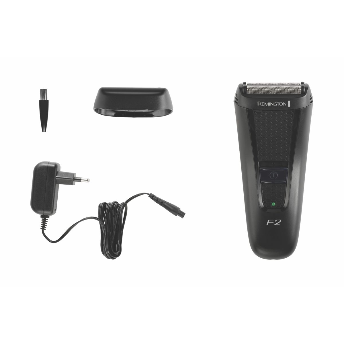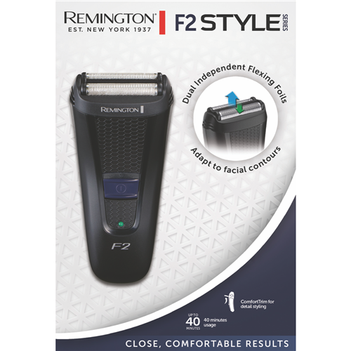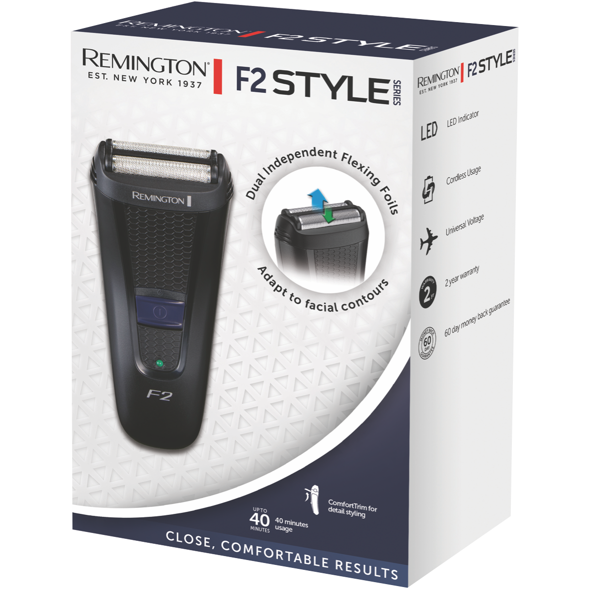 Get a clean comfortable shave with the Remington F2 Style Series Foil Shaver. This cordless electric shaver features dual independent flexing foils that adjust to your facial contours providing a close shave without irritation. The pop-up trimmer is ideal for styling sideburns and moustaches. With up to 40 minutes of cordless runtime per charge you can shave when and where you want. The LED indicator lets you know when it's time to recharge which takes 16 hours. Thanks to the universal voltage you can use this shaver worldwide. It also comes with a head guard for safe storage and transport. Enjoy the convenience of a cordless electric shaver with the Remington F2 Style Series. The manufacturer's part number for this product is F2002AU. Treat yourself to this quality shaver today.