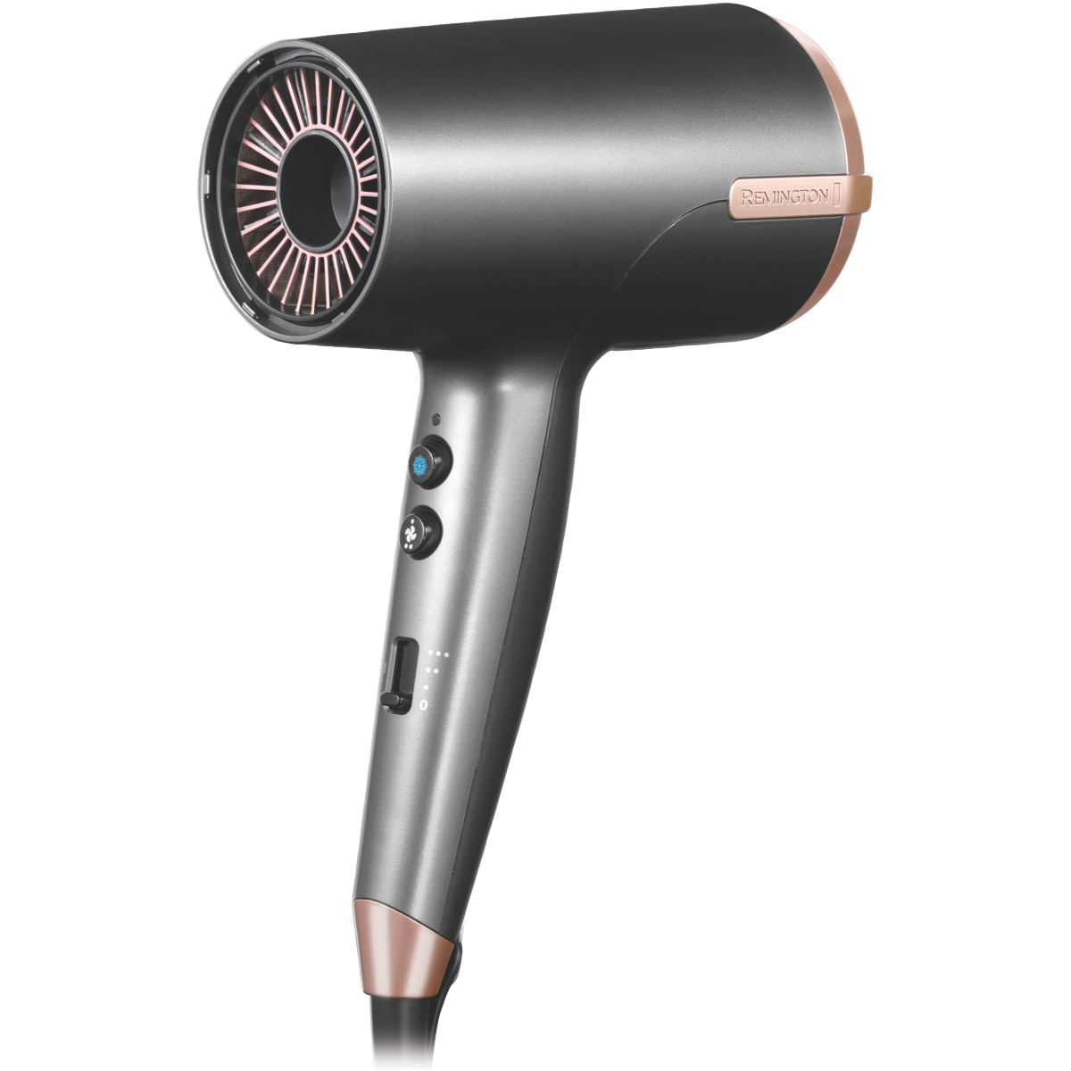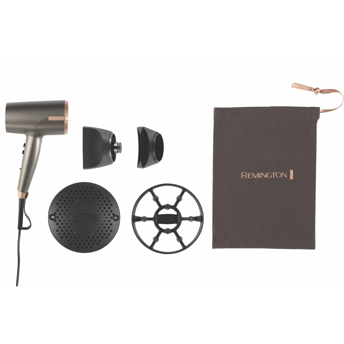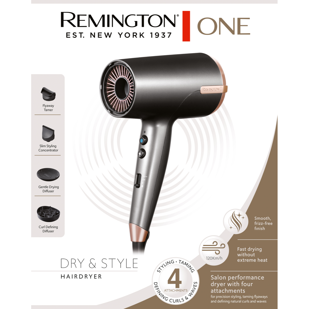 Tame unruly locks and define your style with the Remington One Dry And Styler Hair Dryer. This 2000 watt dryer features 8 heat and speed combinations to customize drying and styling for all hair types. The dual ionic system conditions hair while reducing frizz and the lock-in cool shot sets your look. Four included attachments like the curl-defining diffuser and flyaway tamer allow you to create salon-worthy styles at home. A thermacare sensor protects hair from overheating. Compact and lightweight with a handy hang up loop the Remington makes styling on-the-go a breeze. It comes complete with a luxury storage bag and 3 year warranty. Craft your signature look with this versatile dryer. The manufacturer's part number for this product is D6077AU. Give your hair the star treatment with the Remington One today.