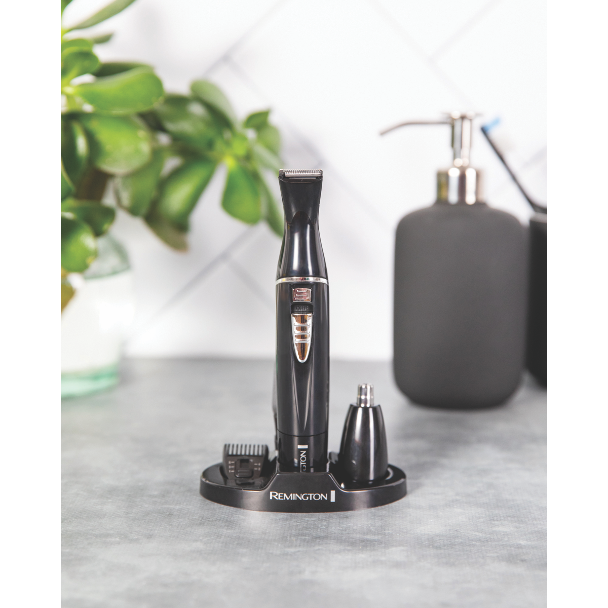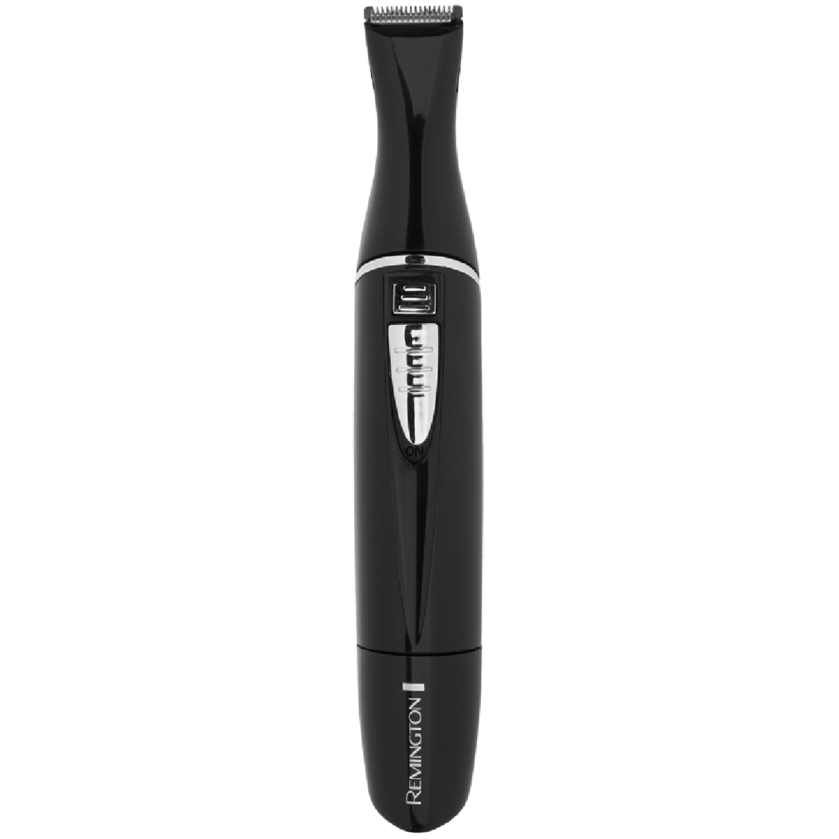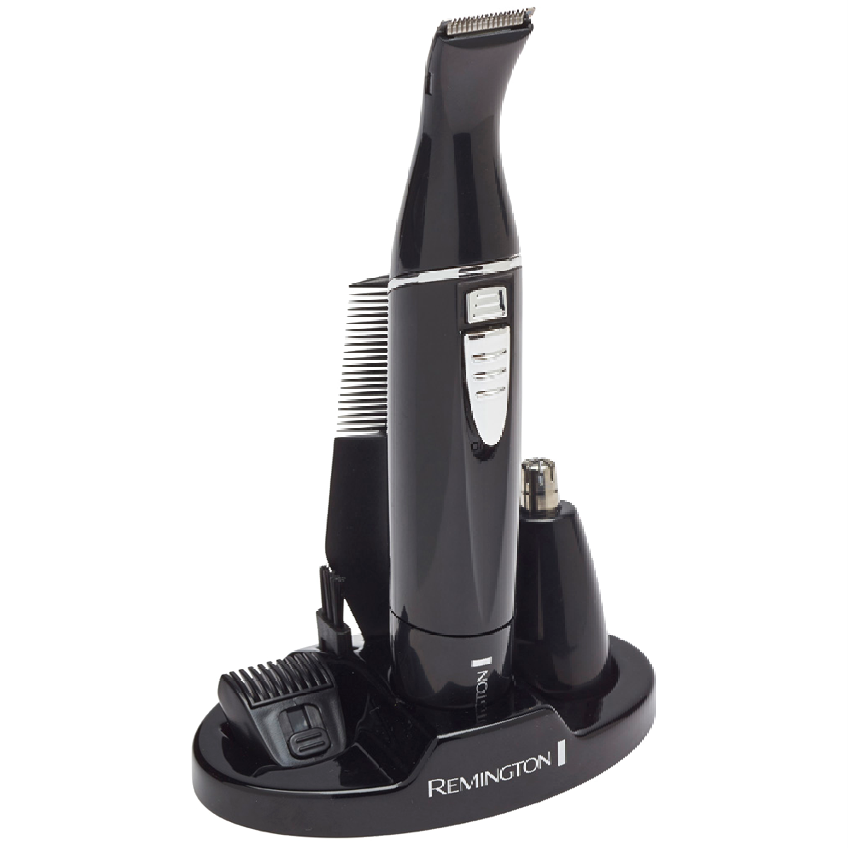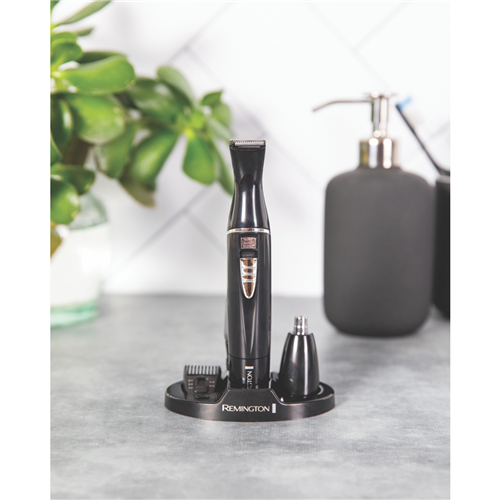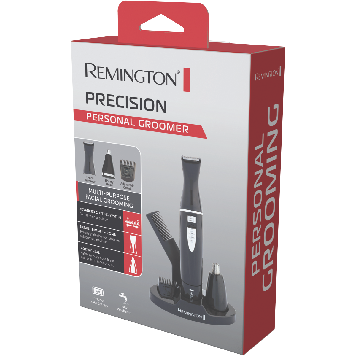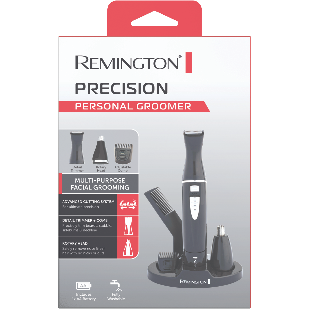 Groom yourself with precision using the Remington Precision Personal Groomer Kit. This battery-powered beard trimmer kit comes with everything you need for a close comfortable shave and precise grooming. The advanced cutting system uses stainless steel blades and an adjustable comb with 5 length settings to trim and style your beard just the way you want. Additional grooming attachments like the detail groomer and nose trimmer allow you to tackle nose and ear hair define edges and maintain eyebrows with ease. With a sleek ergonomic design intuitive controls and a washable head this waterproof groomer makes it simple to trim and tidy up in the shower. The interchangeable heads snap on and off for quick changes and the included stand keeps it organized between uses. Get precision and versatility with the Remington groomer. The manufacturer's part number for this product is PG025AU. Take control of your look today.