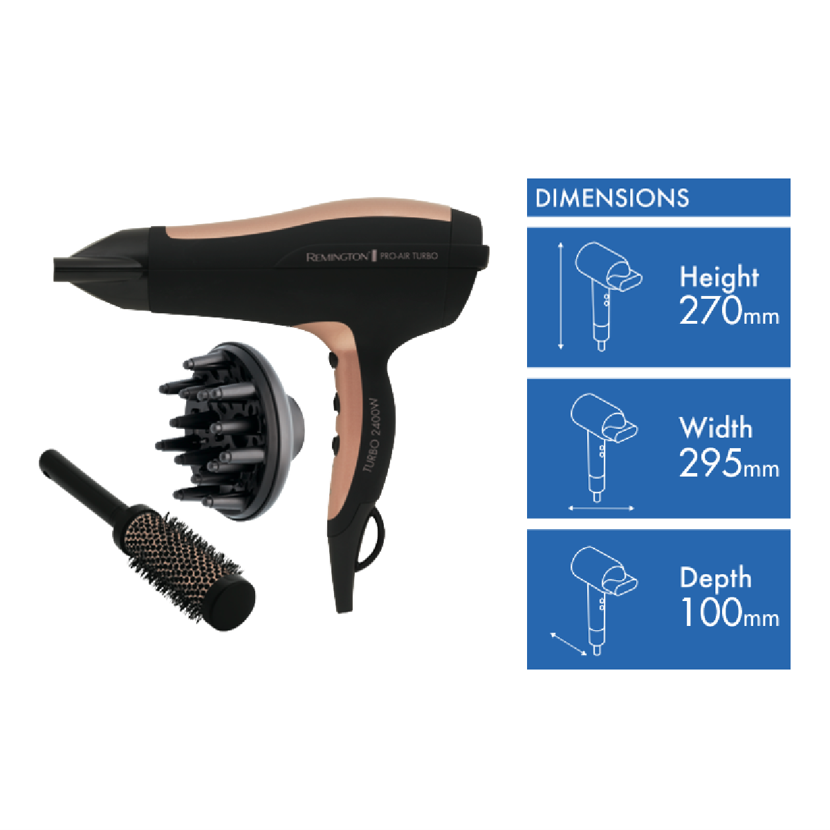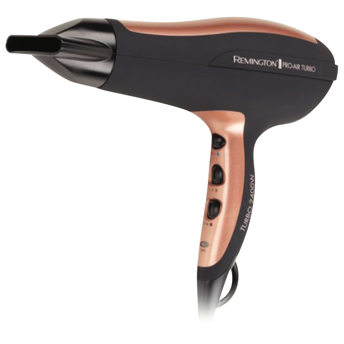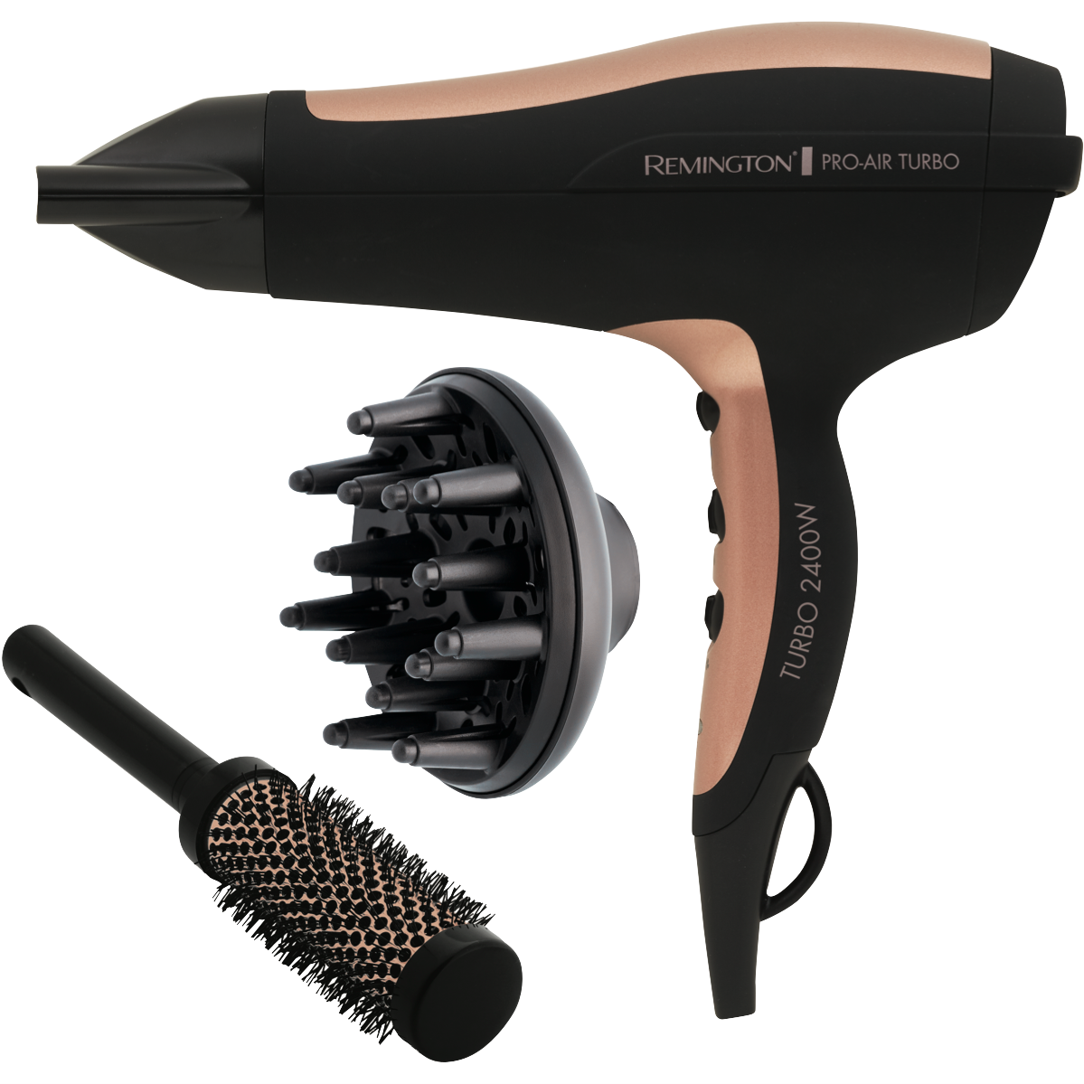 Blast away frizz and dry hair fast with the Remington Pro Air Turbo 2400W hair dryer. This powerful dryer features Ceramic Plus Technology that delivers 10 times more ceramic ions to leave hair smooth and conditioned. With 2400 watts of drying power 2 speed settings and a Turbo Boost function you can quickly style your hair just the way you want. The ionic conditioning releases 90% more ions to reduce frizz and static for a smooth shiny finish. It also has an Ion Indicator Light so you know when the ions are activated. The Pro Air Turbo comes with a concentrator nozzle for focused drying a diffuser for defined curls and waves and a round brush for extra volume and shape. With the included attachments and powerful motor you can achieve salon-quality blowouts at home. The Remington hair dryer's sleek black design looks great on any vanity. Enjoy smoother frizz-free hair in less time with the Pro Air Turbo 2400W dryer. The manufacturer's part number for this product is D5220AU. Give your hair the quick dry and flawless finish it deserves.