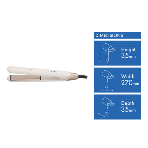 Achieve silky smooth frizz-free hair with the Remington Shea Soft Straightener. This advanced ceramic hair straightener features 110mm plates and heats up in just 15 seconds reaching temperatures between 150 and 230 degrees Celsius for fast and effective straightening. The ionic conditioning technology helps reduce frizz and static leaving hair looking sleek soft and shiny. With safety features like automatic shutoff after 60 minutes and plate lock you can style your hair with peace of mind. The LED indicator lights turbo boost function and special curved housing design provide ease of use and optimal straightening results. Compatible with worldwide voltages and equipped with a swivel cord and storage pouch for convenience this straightener allows you to achieve salon-quality straight hair whether at home or on the go. Backed by Remington's 3 year warranty the Shea Soft Straightener's durable high-performance design provides smooth frizz-free styling for all hair types. Achieve your desired look with this innovative hair straightening solution. The manufacturer's part number for this product is S4740AU. Transform your style with the Remington Shea Soft Straightener today.