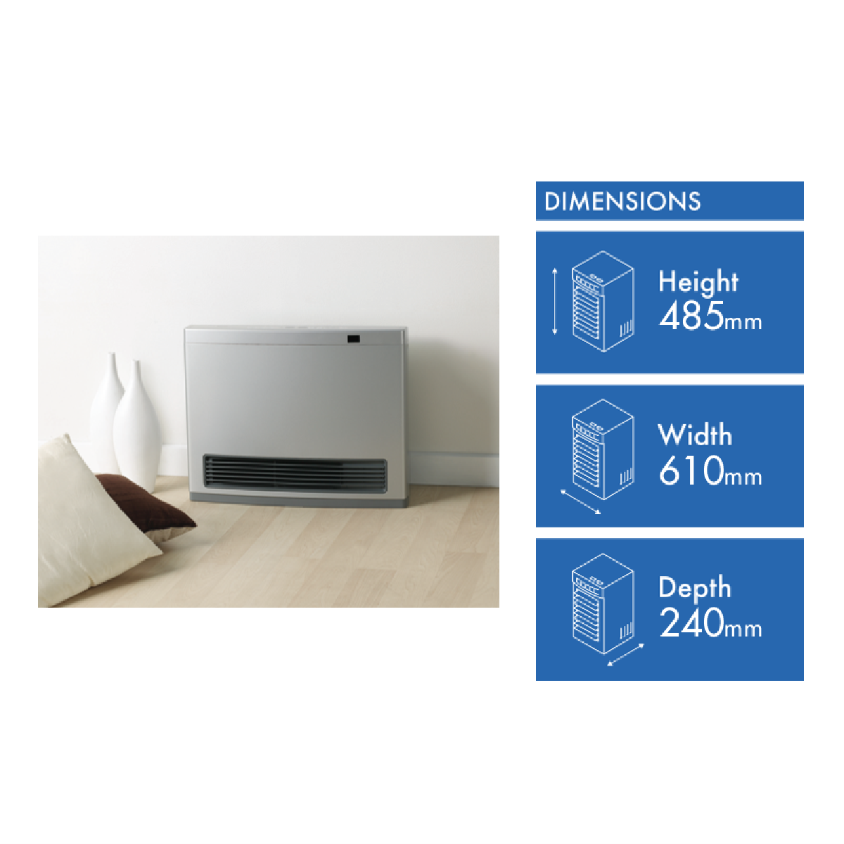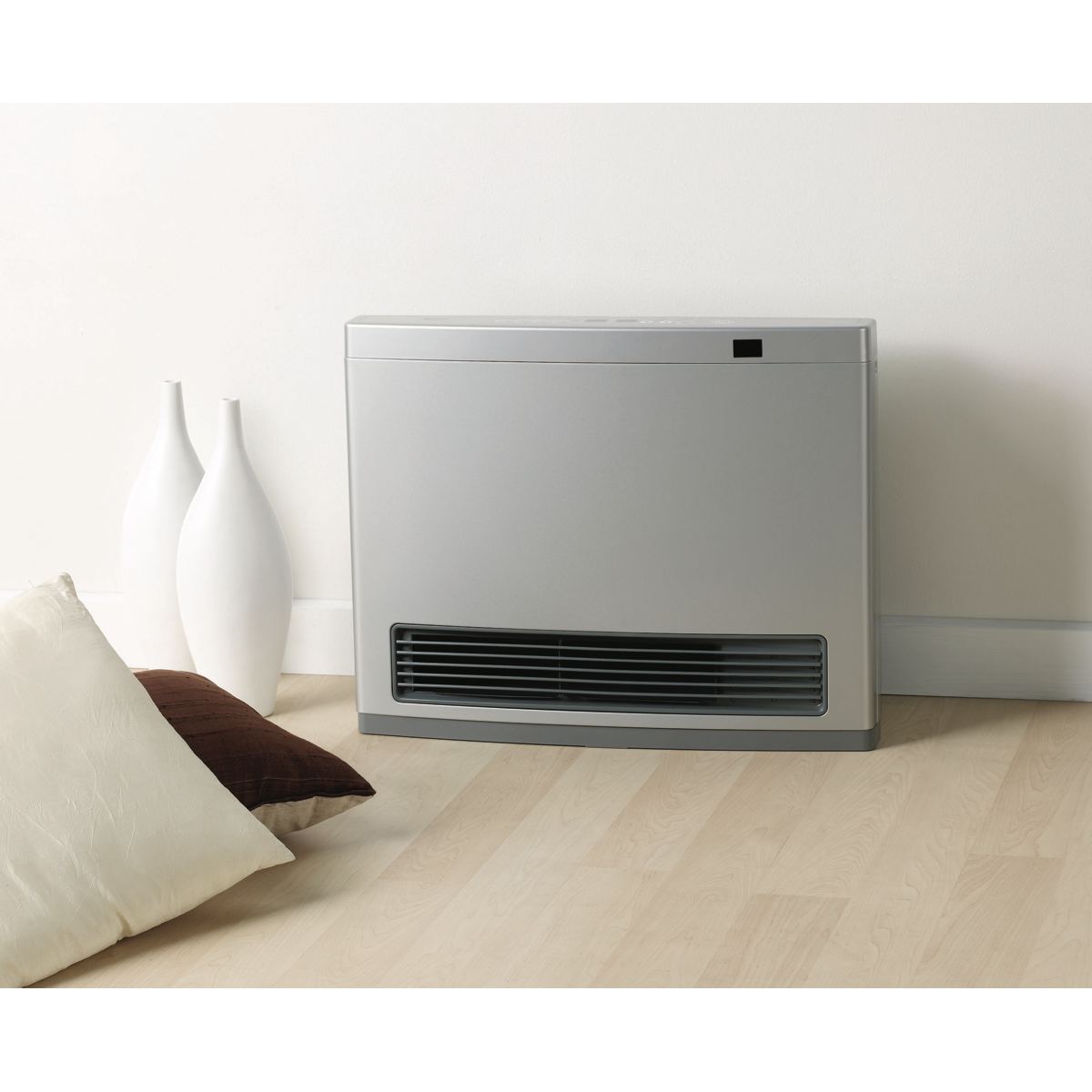 This platinum silver Rinnai Avenger 25 AV25SN3 natural gas heater offers high efficiency heating for large open plan areas. It has the largest gas heat output in Rinnai's convector range with a 5.8 energy efficiency star rating and low emission technology. This heater features electronic thermostatic control economy mode function to help reduce running costs dual programmable timers for mornings and evenings as well as a remote control for added convenience. The Rinnai Avenger 25 convector heater is portable and helps you get warm when you need it most.