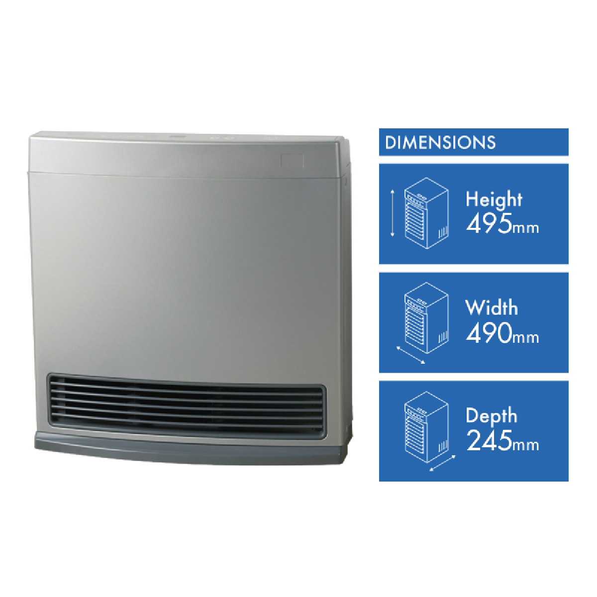 This compact and portable Rinnai Enduro 13 unflued natural gas heater is designed to suit a smaller living space features convenient fully thermostatic control low emissions technology and a 5.8 energy efficiency rating for power bill savings. In a silver contemporary style to suit modern homes the Rinnai Enduro has an Economy mode to help reduce running costs by gradually reducing the heat setting once the room has maintained the set temperature for one hour; also preventing discomfort from overheating. The Rinnai Enduro gas heater has delay on and off countdown timers so you can specifically choose the time you want your heater to turn on or off and also has a child lock for peace of mind. Effectively and efficiently heat the smallest room in your home and enjoy cosy warmth thanks to this Rinnai Enduro 13 natural gas heater.