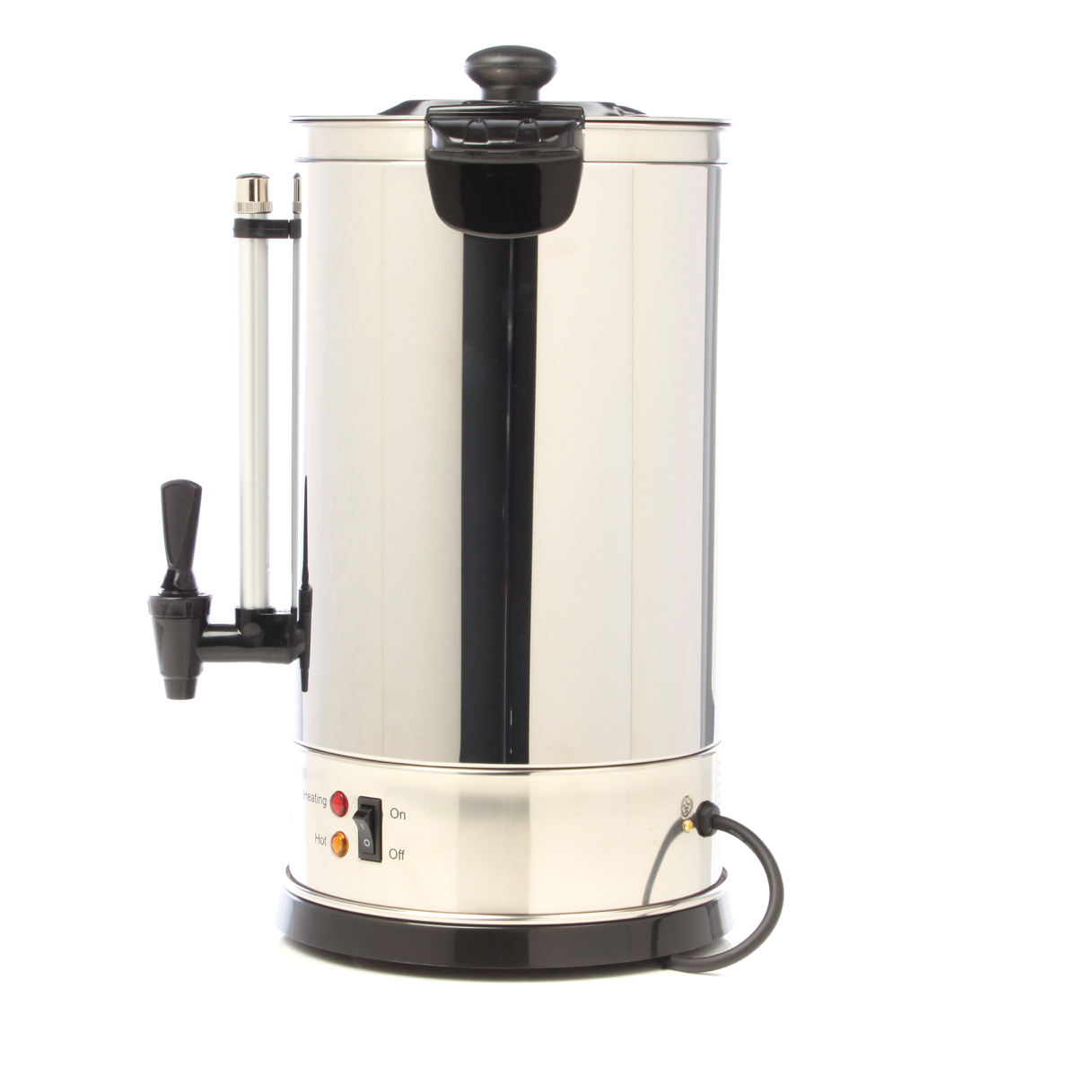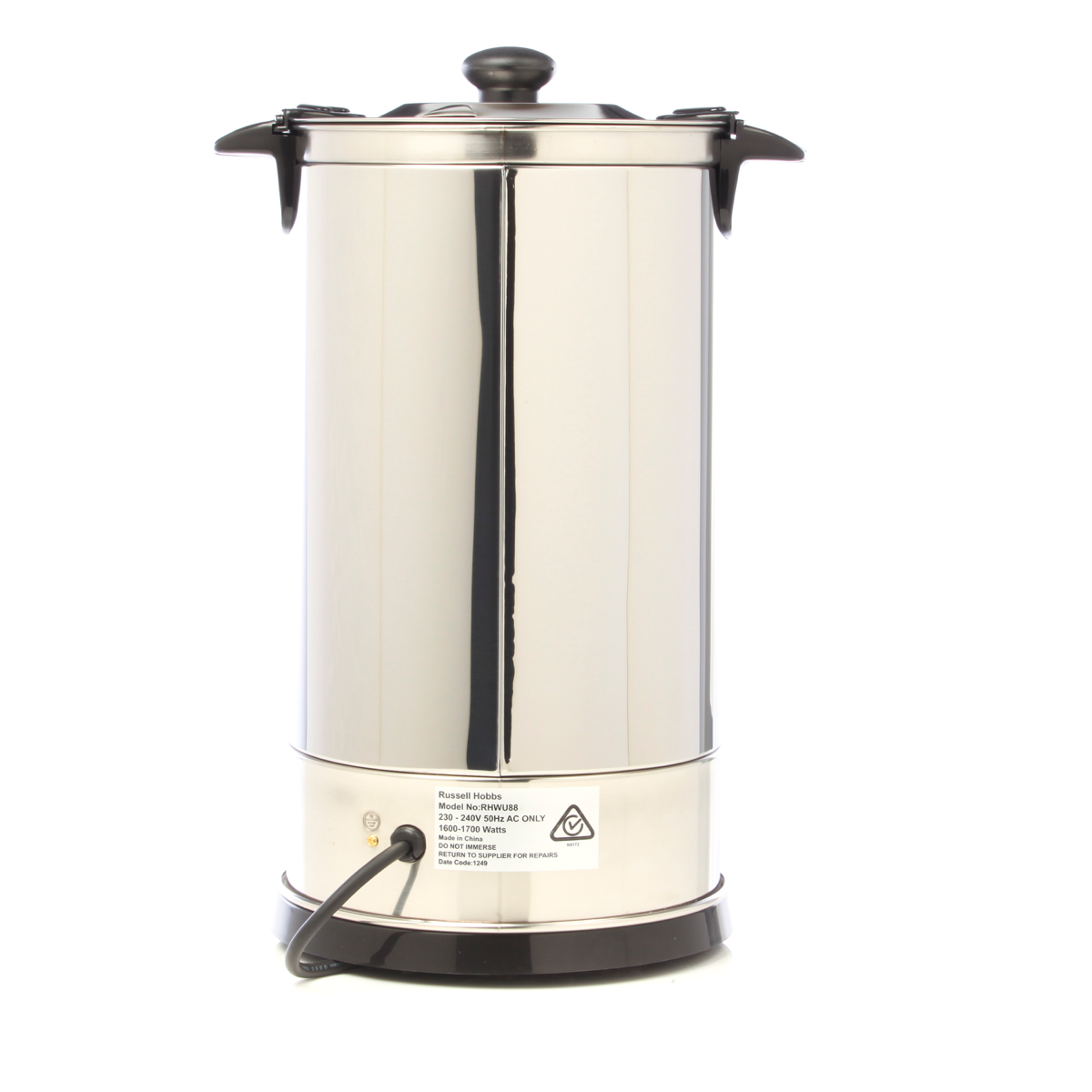 This 8.8litre Russell Hobbs urn holds up to fifty 150ml cups of boiling water so it s perfect for life s celebrations and home-catered occasions. It has a cool touch lid knob cool touch handles twist lock lid with steam tent boil dry protection and multidirectional non-drip tap for safety. It also has two lights that indicate when the water is heating and hot double wall insulation a water window so it s easy to see when the water needs to be refilled and comes with a two-year manufacturer s warranty. With 1300W of power and a keep warm function this chic stainless steel and black Russell Hobbs urn adds style to any occasion and makes fifty cups of tea coffee and hot chocolate so easy.