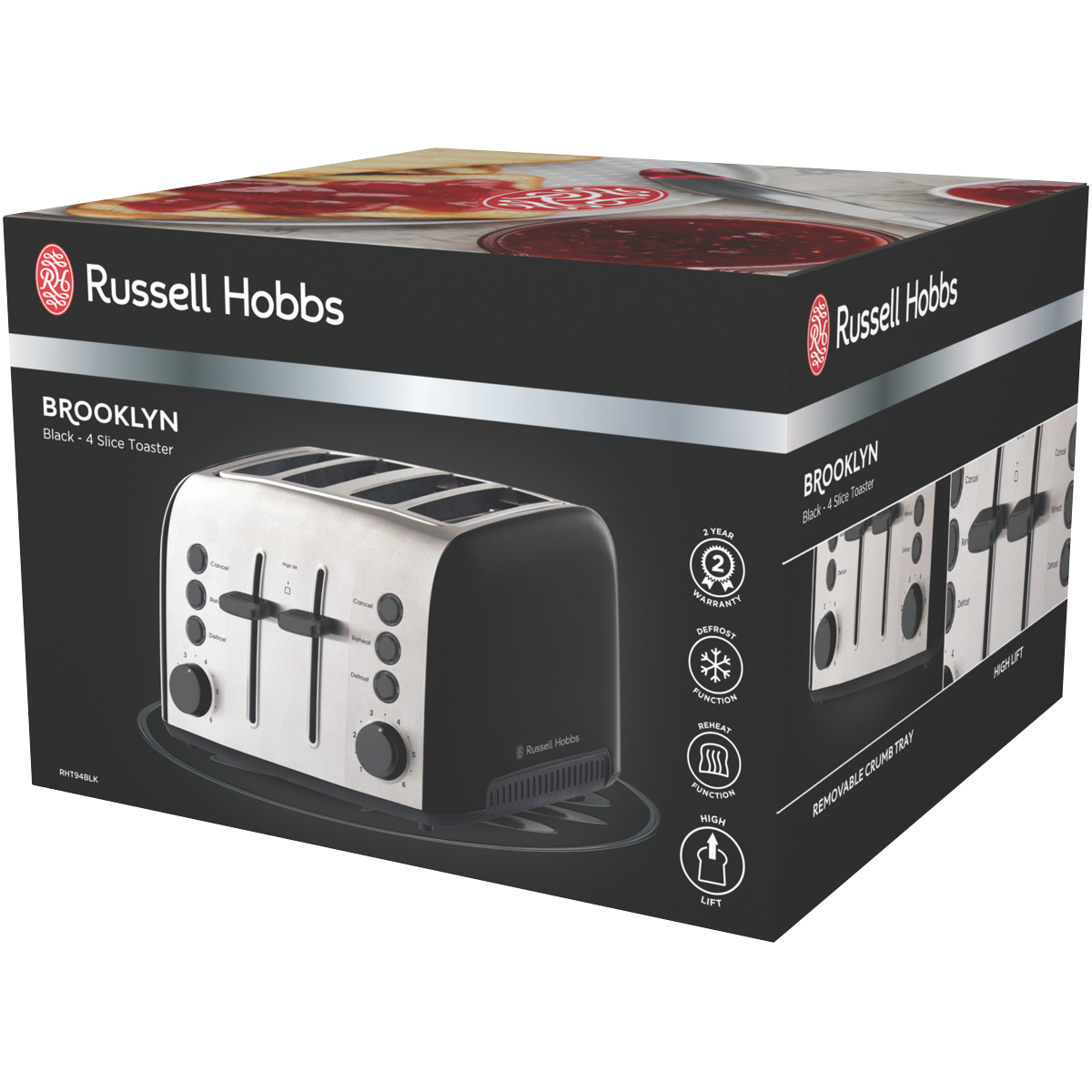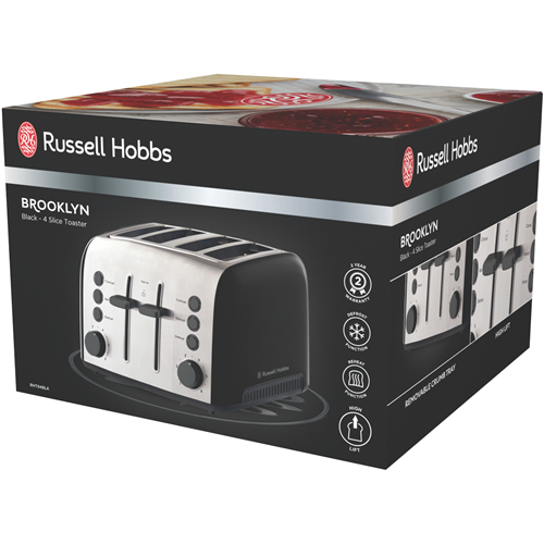 Looking for a stylish and convenient toaster to make breakfast a breeze? The Russell Hobbs Brooklyn 4 Slice Toaster in sleek black is just what you need. With its 4 wide slots you can toast bread bagels and more for the whole family at once. The variable browning control lets you get that perfect golden-brown toast every time while the high lift lever makes it easy to grab even small pieces without burning your fingers. The removable crumb tray keeps your countertop tidy in between uses. And with a contemporary black design featuring matt black body and accents on the dial buttons and lever this toaster looks as good as it performs. Additional useful features include a defrost function to gently thaw and toast frozen bread as well as a reheat function to warm up toast that's gone cold. Backed by Russell Hobbs' 2 year warranty the Brooklyn 4 Slice Toaster combines versatile performance with stylish good looks. Bring home convenience and quality with this must-have breakfast appliance. The manufacturer's part number for this product is RHT94BLK. Check out the Russell Hobbs Brooklyn 4 Slice Toaster today!
