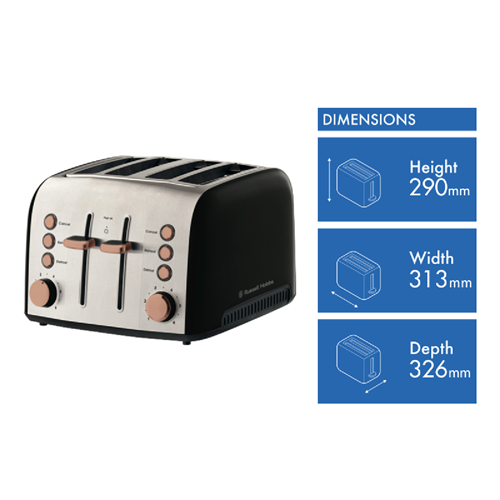 Bring breakfast to life with the Russell Hobbs Brooklyn 4 Slice Toaster in eye-catching copper. With its sleek design and soft-touch accents this toaster adds a touch of elegance to any kitchen. The extra wide slots easily fit thick slices of bread bagels and more. Dual independent control panels allow you to toast each pair of slots to your liking thanks to variable browning settings. Never worry about cold spots again with the convenient defrost and reheat functions. Illuminated buttons make operation a breeze even in dim lighting. Removable crumb trays simplify cleanup while the high lift lever prevents burning your fingers. Crafted to withstand daily use thanks to a durable stainless steel body this Russell Hobbs toaster carries a 2 year manufacturer's warranty for peace of mind. Give your mornings a stylish start with the Russell Hobbs Brooklyn 4 Slice Toaster. The manufacturer's part number for this product is RHT94COP. Check it out today.