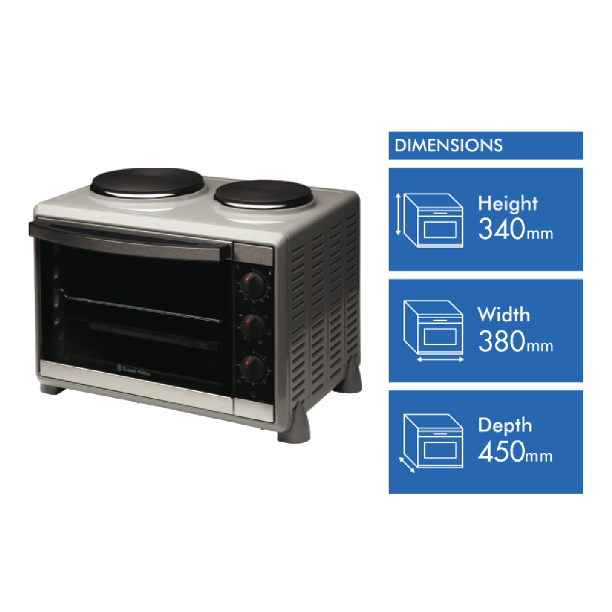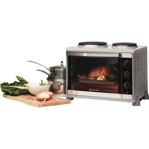 Cook up a storm in your kitchen with the Russell Hobbs Compact Toaster Oven. This versatile multi-function electric cooker lets you roast bake grill fry and boil right on your countertop. With 30 litres of capacity and 1600 watts of power you'll have all the space and heat needed to prepare delicious meals. The thermostatic controls range from 60 to 230°C giving you precise control over cooking. Monitor your food through the semi-transparent mirrored glass door. Accessories like the baking tray and grilling rack with handle maximize your cooking options. And with a 2 year manufacturer's warranty you can count on this quality Russell Hobbs oven to be a workhorse in your kitchen for years to come. At 380mm wide 340mm high and 450mm deep this compact oven won't take up too much precious counter space. Plus it's not too heavy at 11kg so you can easily move it as needed. Take your cooking to the next level and enjoy the convenience of an oven right in your kitchen with the Russell Hobbs Compact Toaster Oven. The manufacturer's part number for this product is RHTOV2HP. Check out this versatile benchtop oven today for all your cooking needs.