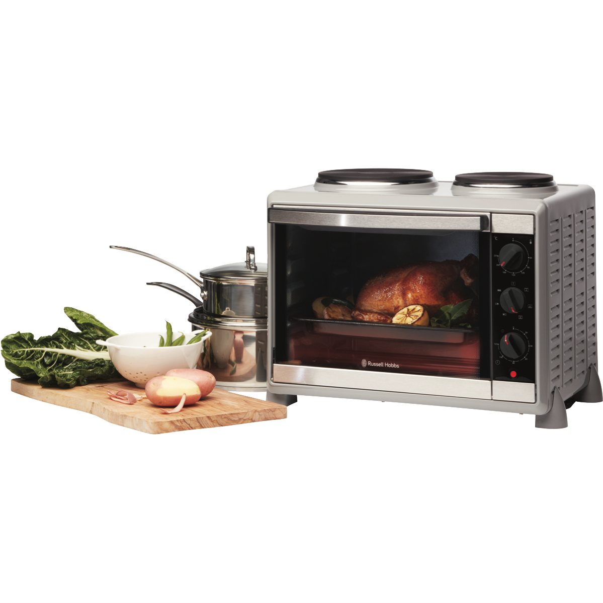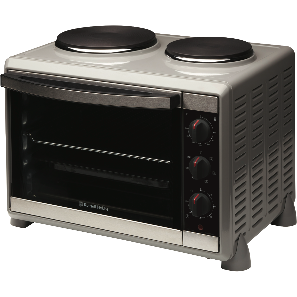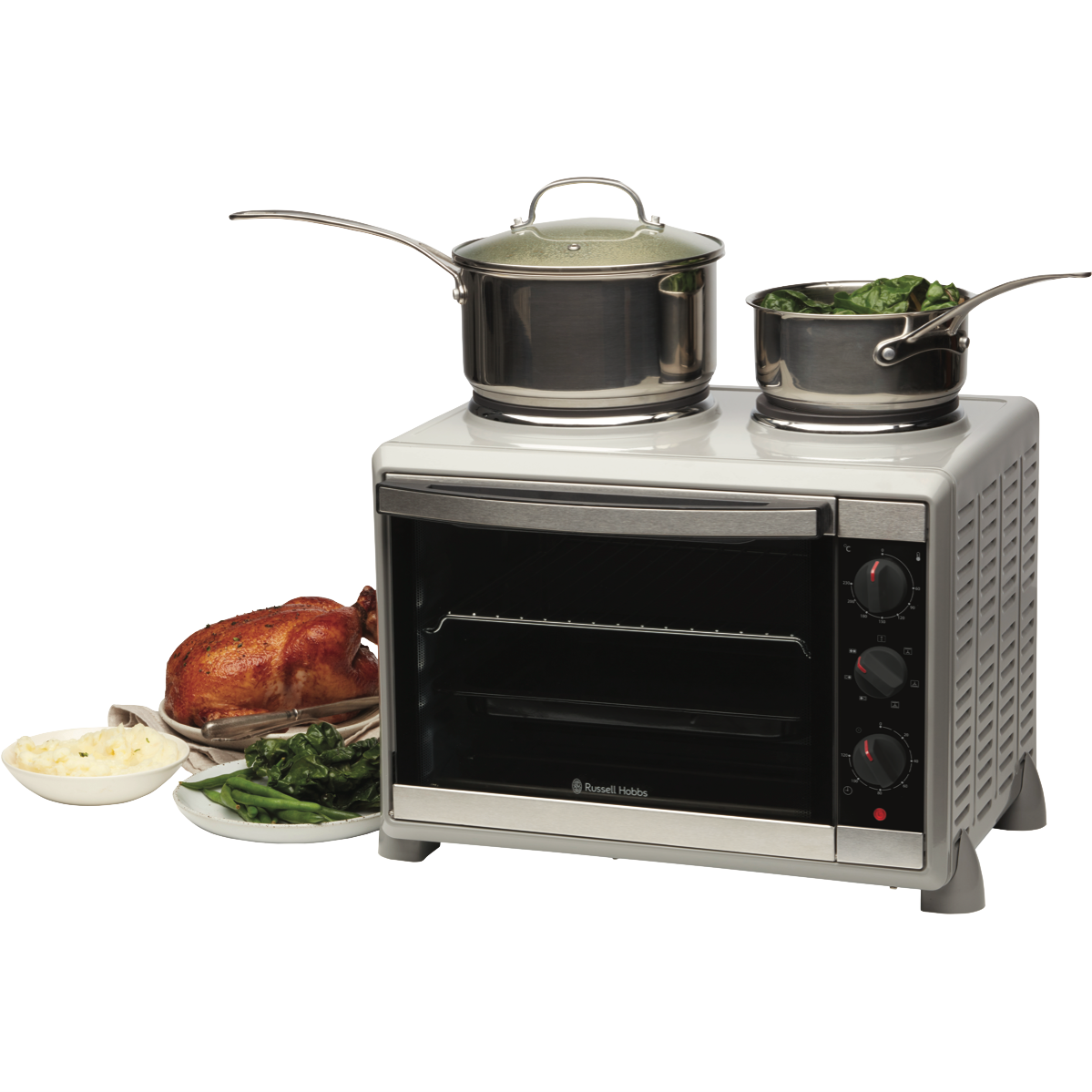 Additional Features Multi-function electric compact cooker with hotplates for roasting, baking, grilling, frying %26amp; boiling, Thermostatic controls 60 - 230%26#176;C, Semi transparent mirrored glass door