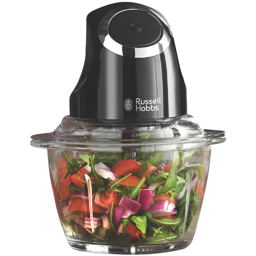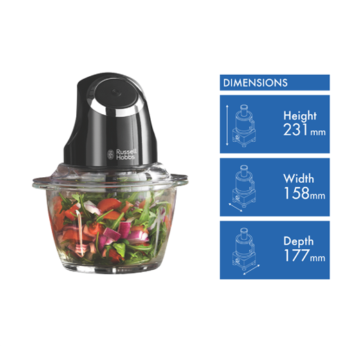 Chop slice and dice with ease using the Russell Hobbs Desire Matt Black Chopper. This 200-watt food chopper features a 1 litre glass bowl with 500ml food capacity perfect for preparing ingredients for soups dips and more. The dishwasher safe design allows for quick clean up after use. With its compact 231mm height 158mm width and 177mm depth it won't take up too much room on your kitchen benchtop or in storage. Key features include the BPA free materials handy storage lid stainless steel S blade for efficient chopping and a 2 year manufacturer's warranty for peace of mind. Effortlessly chop vegetables nuts herbs and other ingredients to your desired texture with the robust 200 watt motor. The Russell Hobbs Desire Matt Black Chopper makes food prep fast and convenient. The manufacturer's part number for this product is RHMFP5BLK. Check out this versatile chopper to streamline meal preparation today.