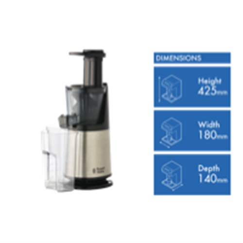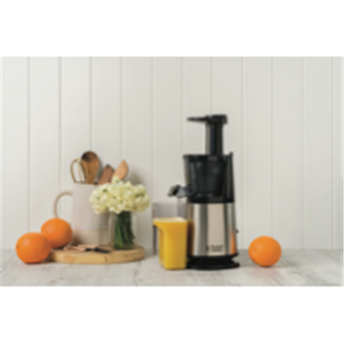 Take your health into your own hands with the Russell Hobbs Luxe Cold Press Slow Juicer. This sleek stainless steel and black juicer utilizes a low speed juicing method to gently extract the maximum amount of nutrients vitamins and enzymes from fruits and vegetables. The 150 watt motor and single speed setting make juicing simple. Just add your ingredients to the 1L capacity chute and let the stainless steel blade work its magic. With 3 handy filters included you can fine tune your juice to suit your tastes. The fine filter is ideal for nutrient-packed normal juicing. The coarse filter lets you add some pulp for texture. And the frozen attachment lets you whip up delicious sorbet for a cool treat. This juicer is designed for easy use and cleaning. The compact footprint fits neatly on your countertop while the easy clean system makes rinses fast. Crafted from BPA-free materials you can juice with confidence. Backed by a 2 year manufacturer's warranty this juicer provides healthy homemade juice for years to come. The manufacturer's part number for this product is RHSJ100. Add the Russell Hobbs Luxe Cold Press Slow Juicer to your cart today for fresh nourishing juice.