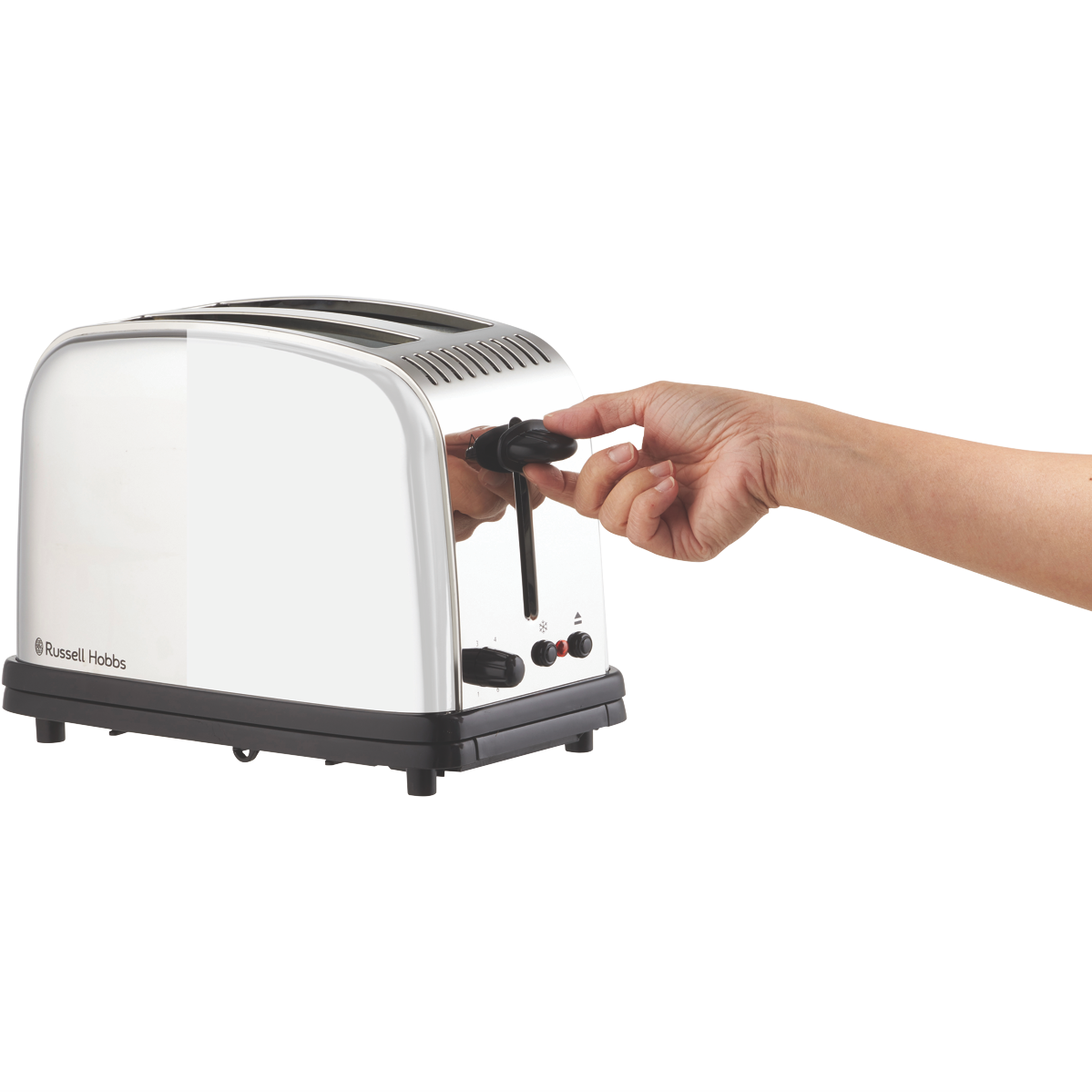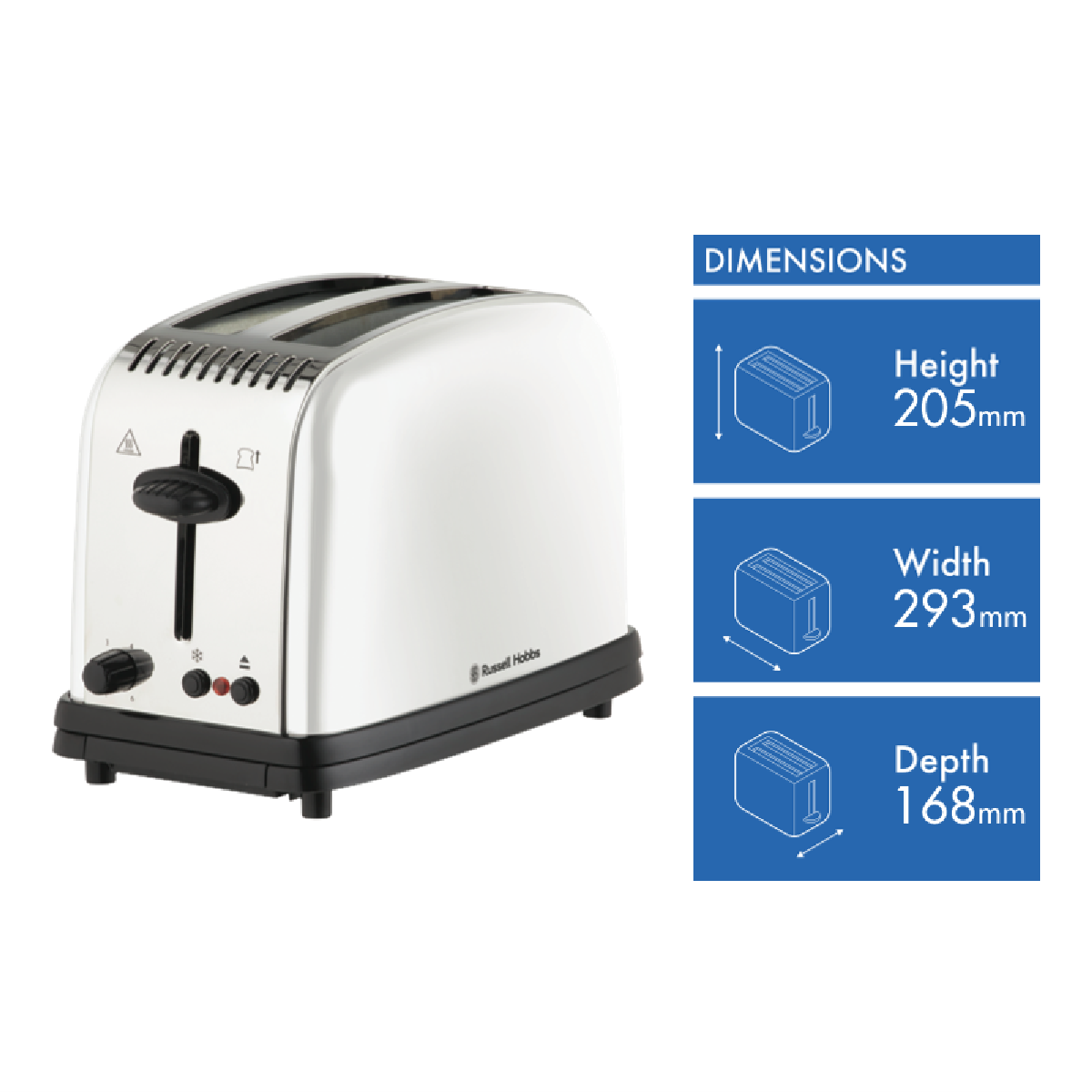 Bring cafe-quality toast to your kitchen with the Russell Hobbs Paddington 2 Slice Toaster. Crafted in brushed stainless steel with a sleek white finish this toaster features self-centring slots to perfectly frame your bread delivering even browning for delicious toast every time. The variable browning control allows you to achieve your ideal shade while the high lift lever makes it easy to retrieve smaller items. With 50% faster toasting technology you can enjoy quicker breakfasts. The removable crumb tray keeps your countertop tidy and cord storage keeps things neat when not in use. Backed by a 2 year manufacturer's warranty this toaster combines thoughtful design with reliable performance. Add a touch of modern style to your kitchen with the Russell Hobbs Paddington Toaster. The manufacturer's part number for this product is RHT12WHI. Check out this toaster and all its features online today.