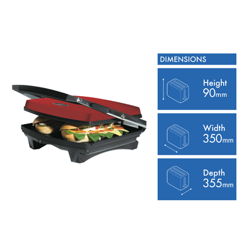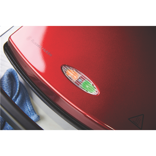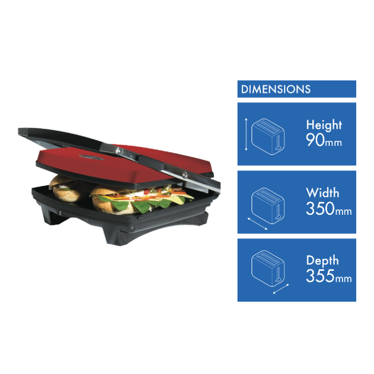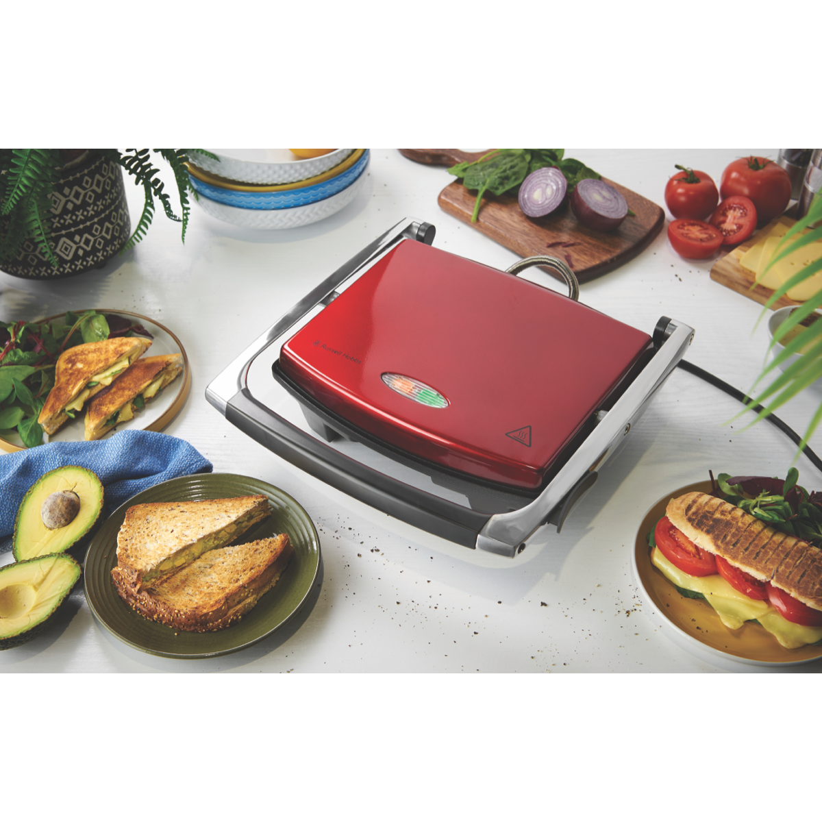The Russell Hobbs Sandwich Press - Red RHSP801RED with a stainless steel finish is a fantastic accessory for enjoyers of deliciously toasted paninis turkish breads toasties focaccias jaffles and more. 2100W of power is delivered to crisp up to four slices of bread in capacity. Accomodate any thickness with a floating hinge up top and indicator lights showing when its time to put in or take out your toasted creations. Flat non stick plates provide an even seal and clean up easily and the whole unit can be locked together and stored vertically to free up some bench space.