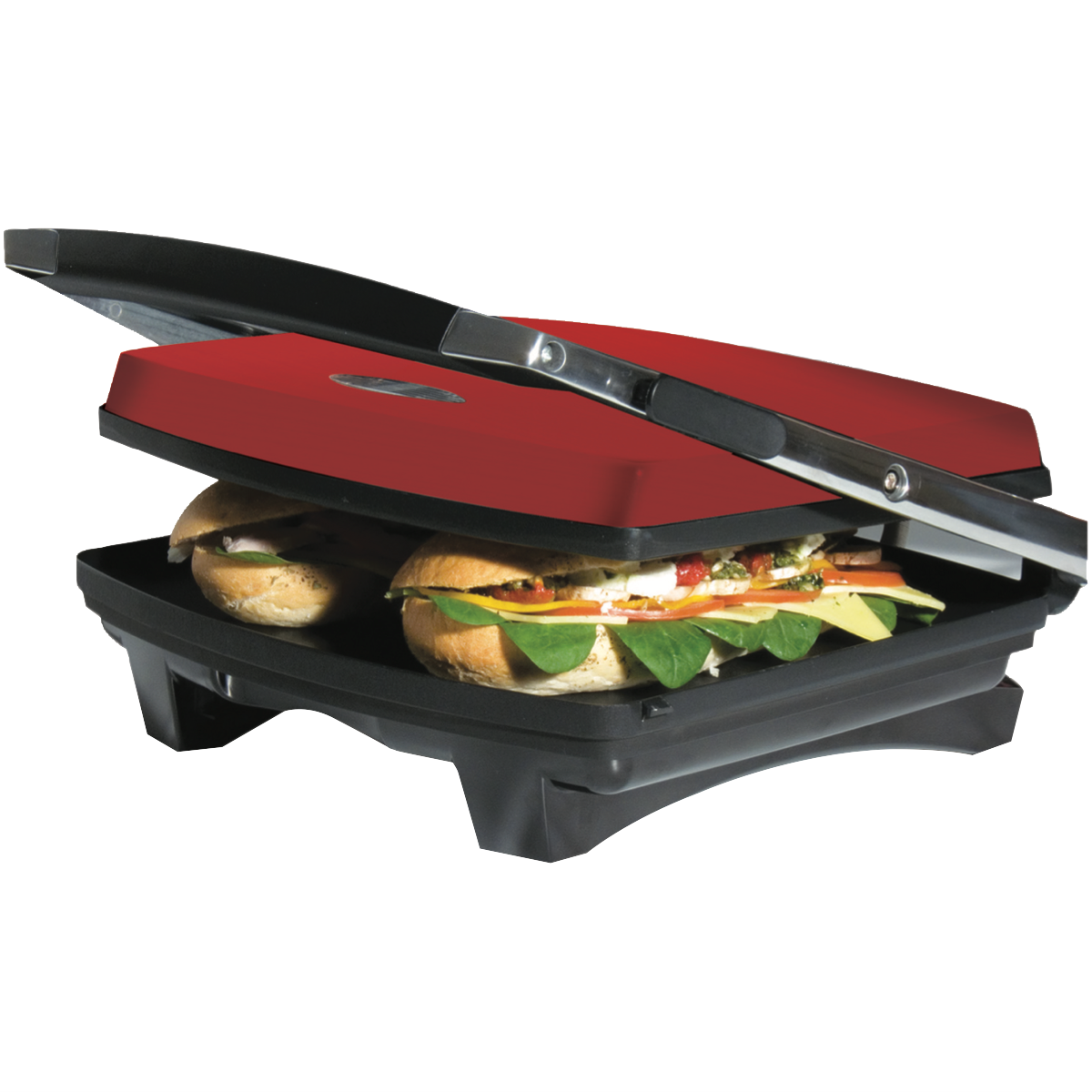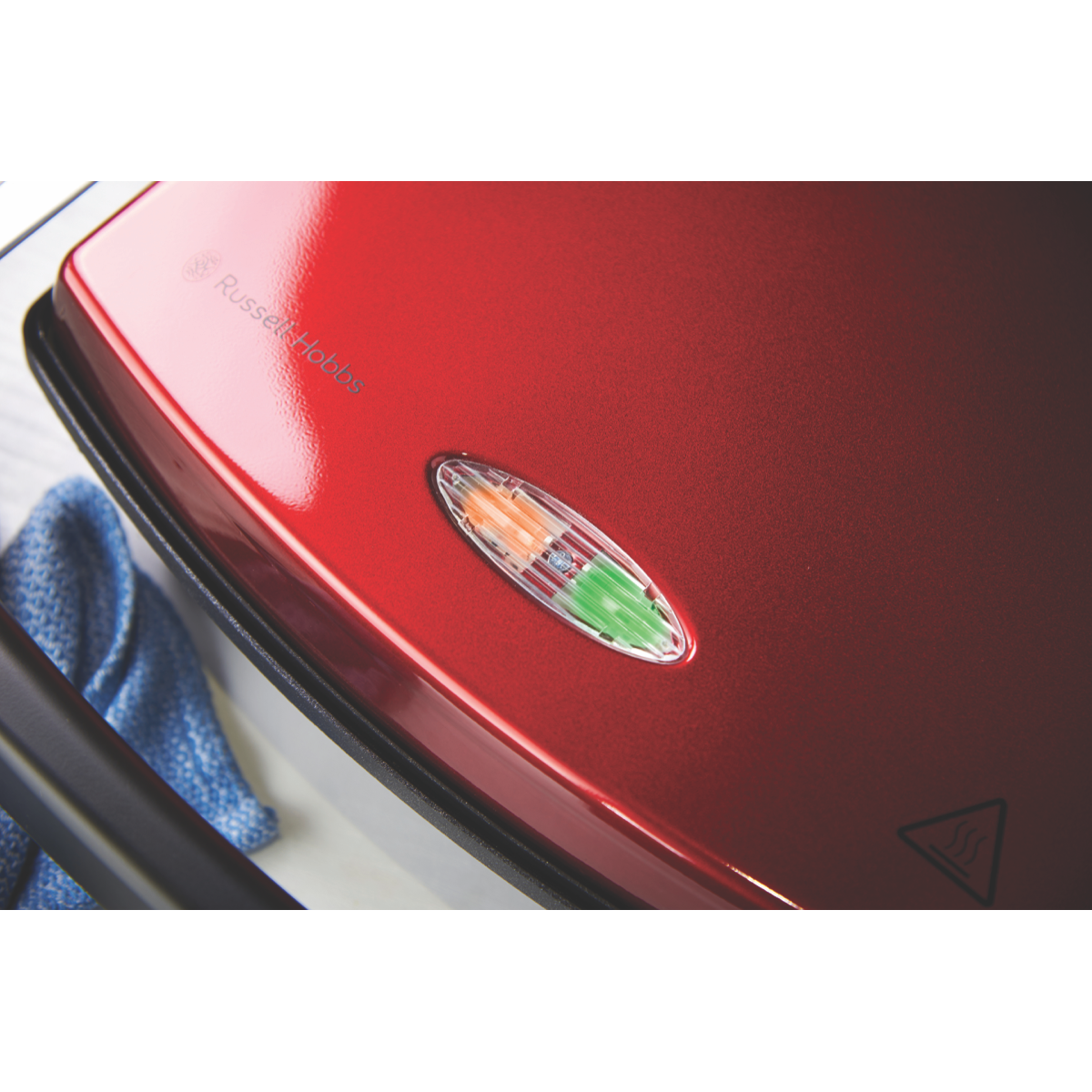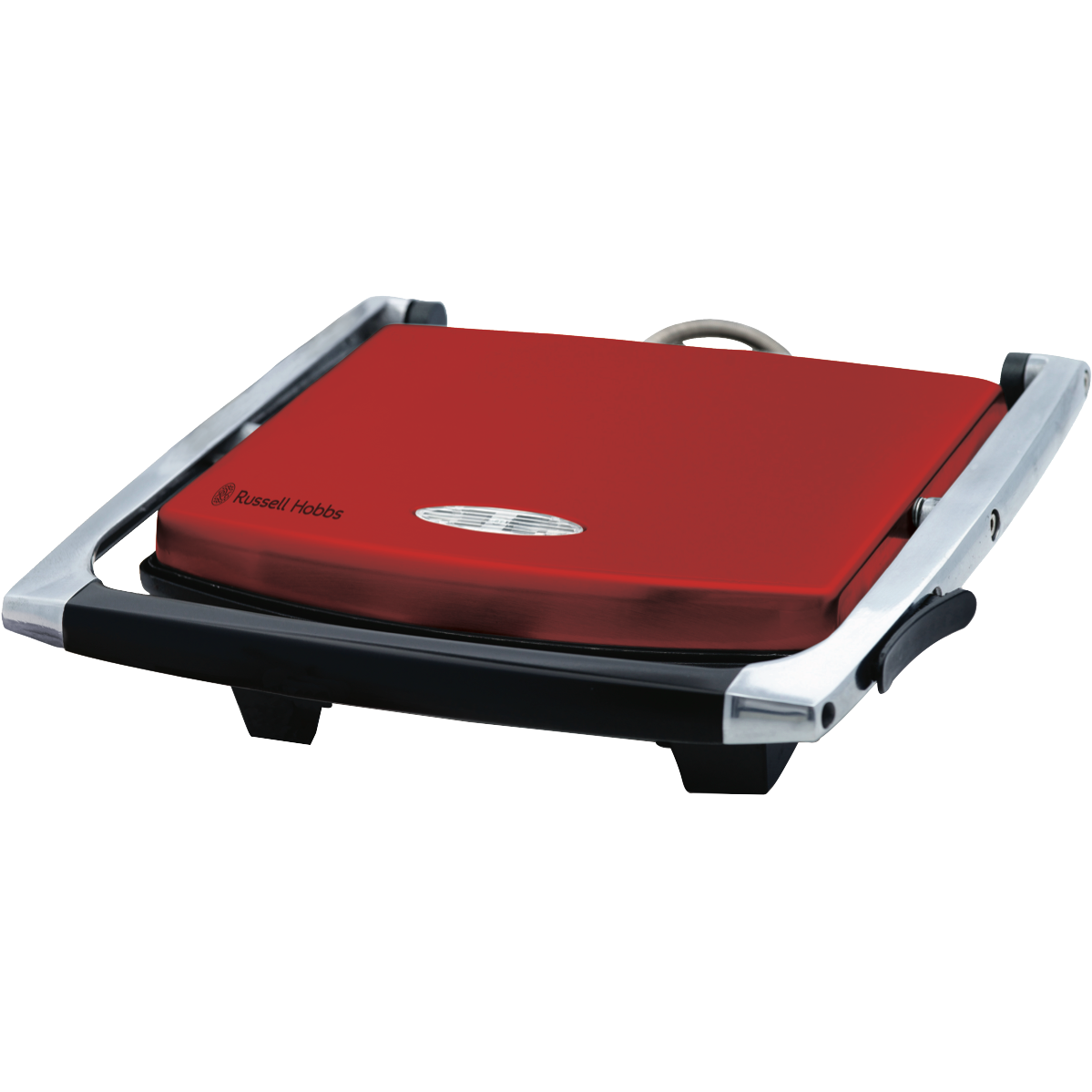 The Russell Hobbs Sandwich Press - Red RHSP801RED with a stainless steel finish is a fantastic accessory for enjoyers of deliciously toasted paninis turkish breads toasties focaccias jaffles and more. 2100W of power is delivered to crisp up to four slices of bread in capacity. Accomodate any thickness with a floating hinge up top and indicator lights showing when its time to put in or take out your toasted creations. Flat non stick plates provide an even seal and clean up easily and the whole unit can be locked together and stored vertically to free up some bench space.