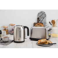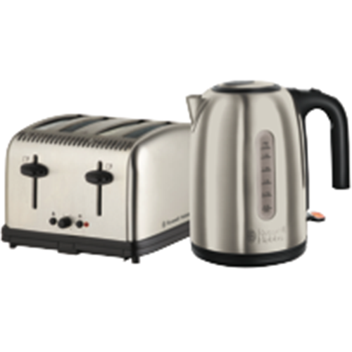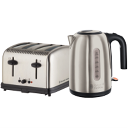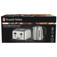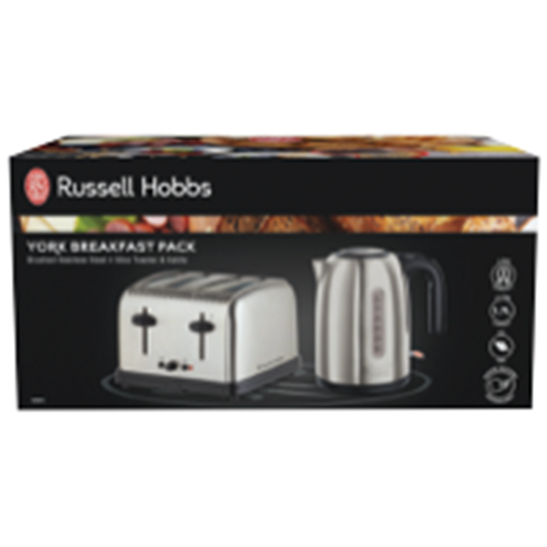 Start your mornings right with the Russell Hobbs York Breakfast Pack. This stylish stainless steel duo includes everything you need to prepare a delicious breakfast at home. The 4-slice toaster features variable browning control so you can toast to your liking. Its extra-wide slots easily fit thick bread bagels and more. Meanwhile the 1.7L kettle boils water rapidly for tea coffee oatmeal and more. With a sleek mirror finish blue illumination and coordinated design this breakfast pair looks great on your countertop. Enjoy convenience with the cord storage and non-slip feet. Reliable and easy to use this breakfast pack from Russell Hobbs helps make your mornings easy. The manufacturer's part number for this product is RHBP2. See our range for more great breakfast appliance deals.
