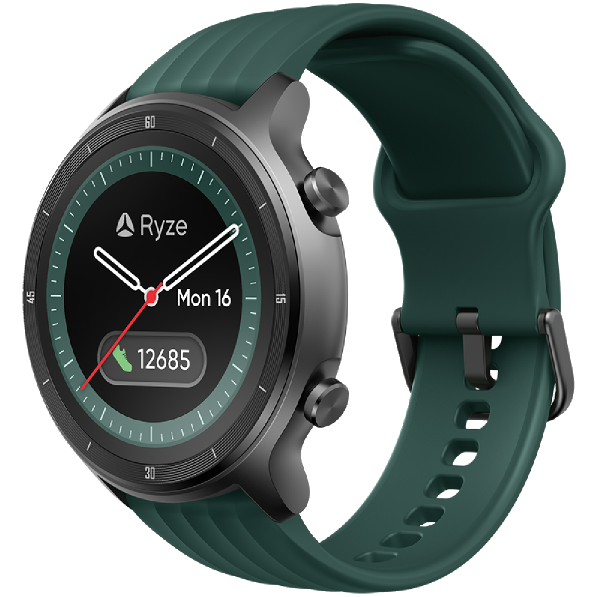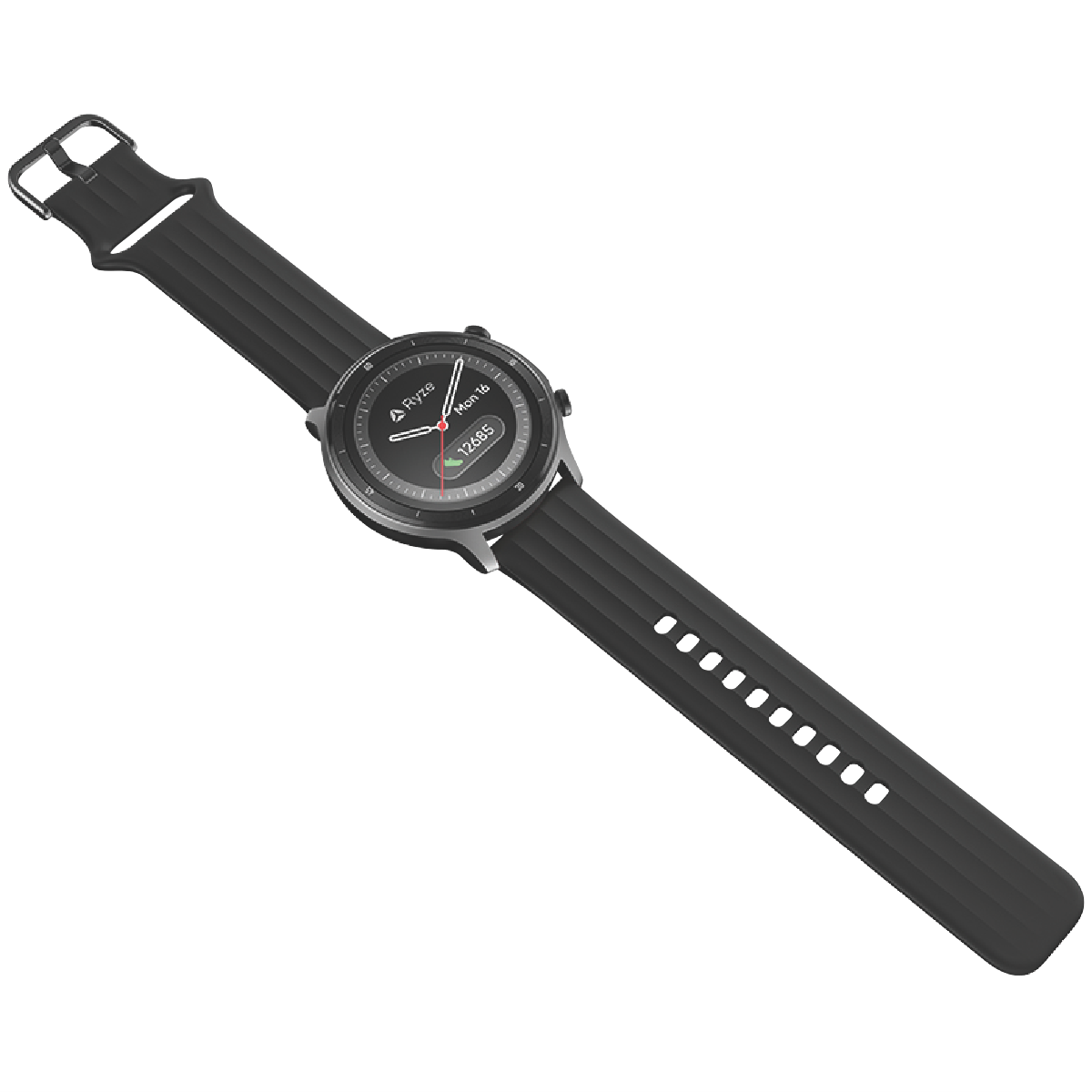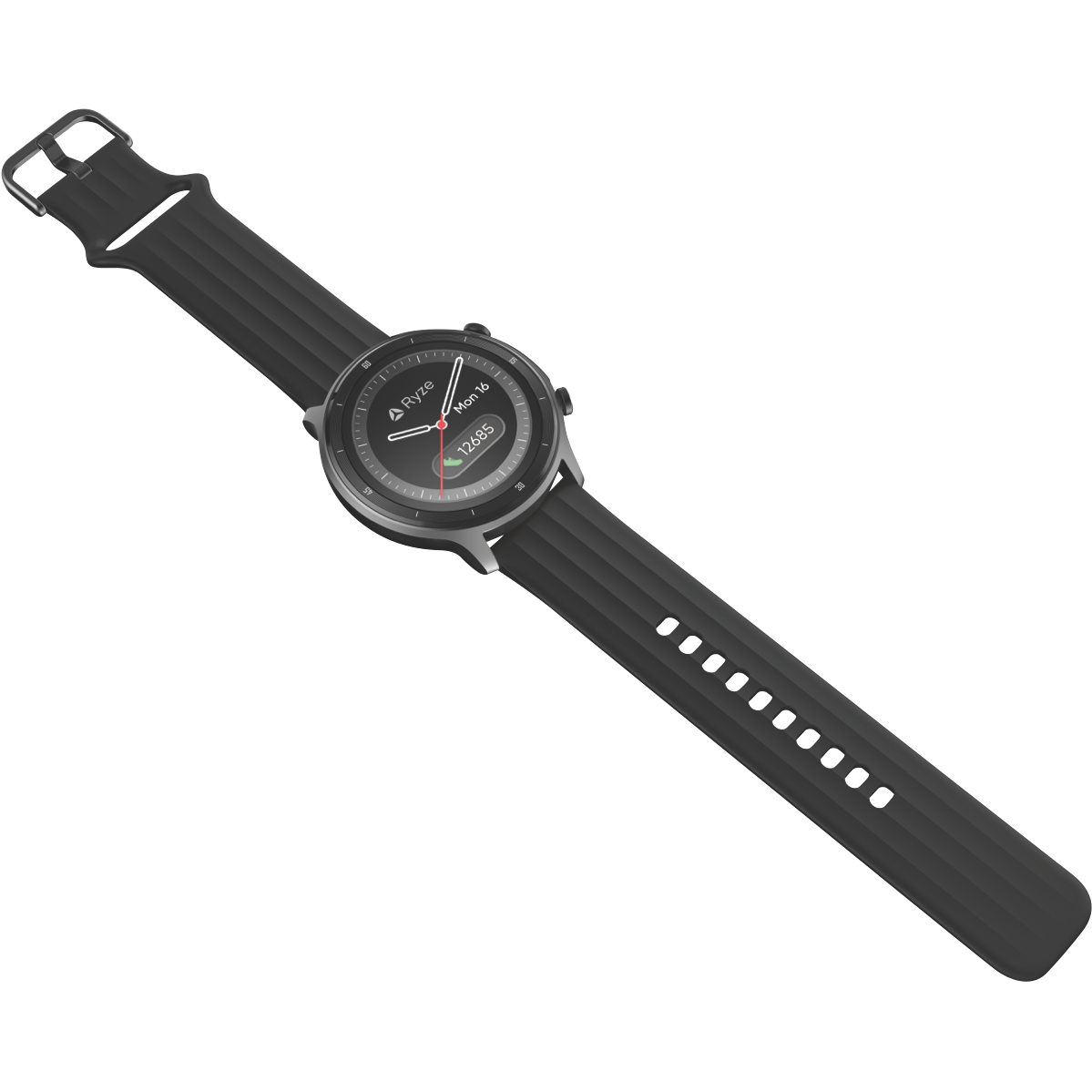 Step into the future with the sleek new Ryze Flex Smartwatch. This versatile smartwatch comes in a stylish dark grey case with a comfortable black strap letting you effortlessly track your health fitness and daily life. Boasting a 1.28 full colour touchscreen the Ryze Flex makes it easy to view notifications track your heart rate and activity and customise watch faces on the go. It packs an array of sensors including heart rate monitoring sleep tracking with sleep quality analysis a pedometer and built-in GPS so you can accurately track pace distance and routes during outdoor workouts. With a water resistance rating of IP68 and 3ATM you can even wear it swimming. Syncing via Bluetooth 5.0 the Ryze Flex Smartwatch enables you to get call text and app notifications right on your wrist. The long-lasting battery provides up to 7 days of use per charge. You can even use the built-in microphone for hands-free voice commands. The Ryze Flex Smartwatch combines fitness tracking and smart features in a durable lightweight smartwatch. Keep connected and monitor your health with this versatile and stylish smartwatch. The manufacturer's part number for this product is RZ-FLBK.