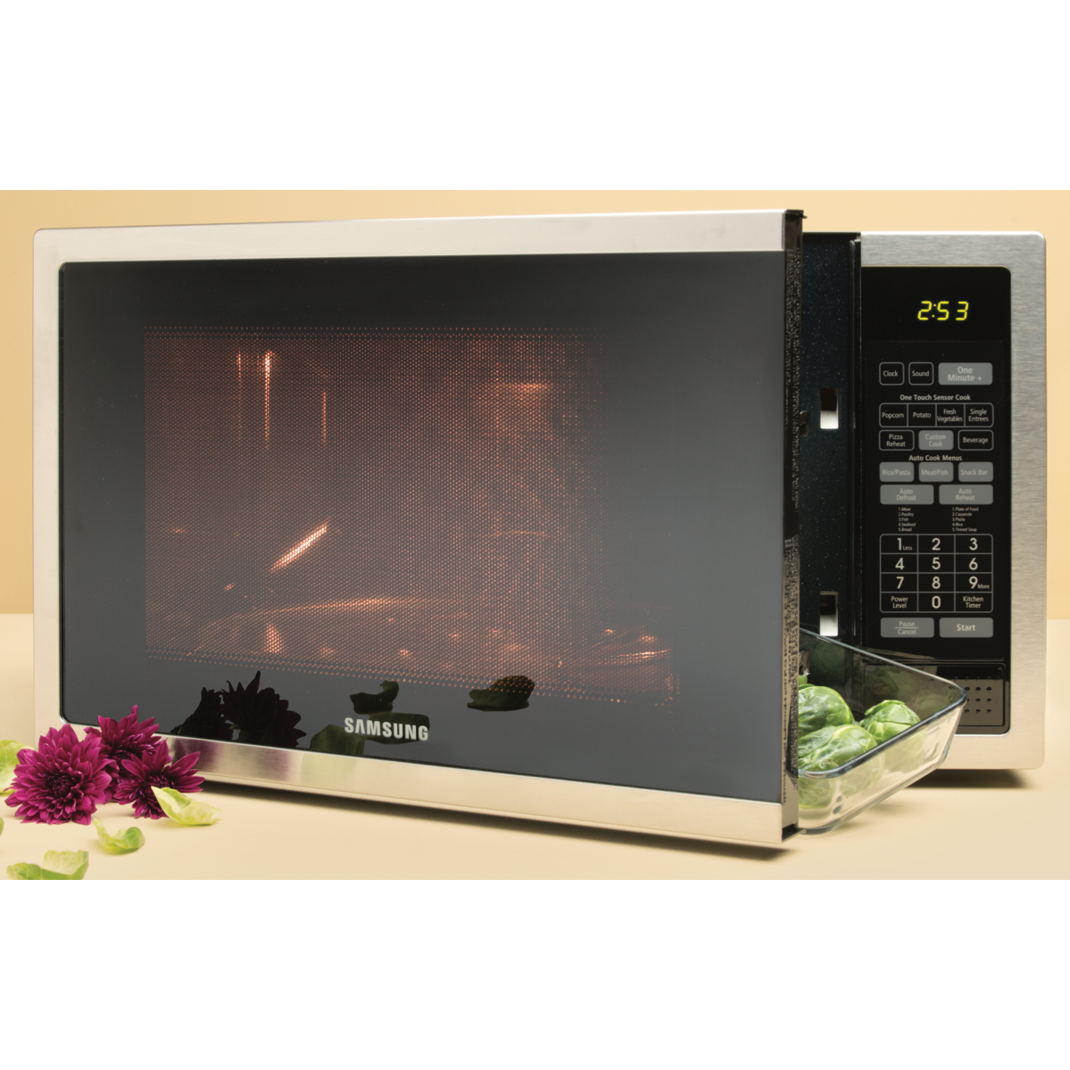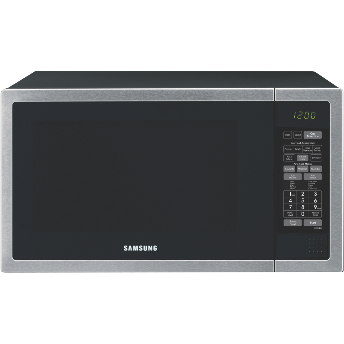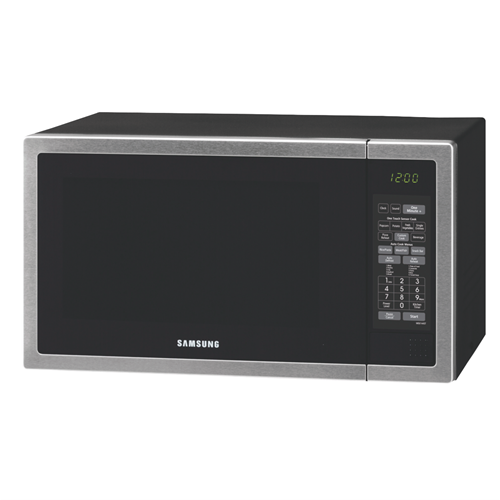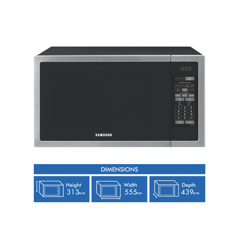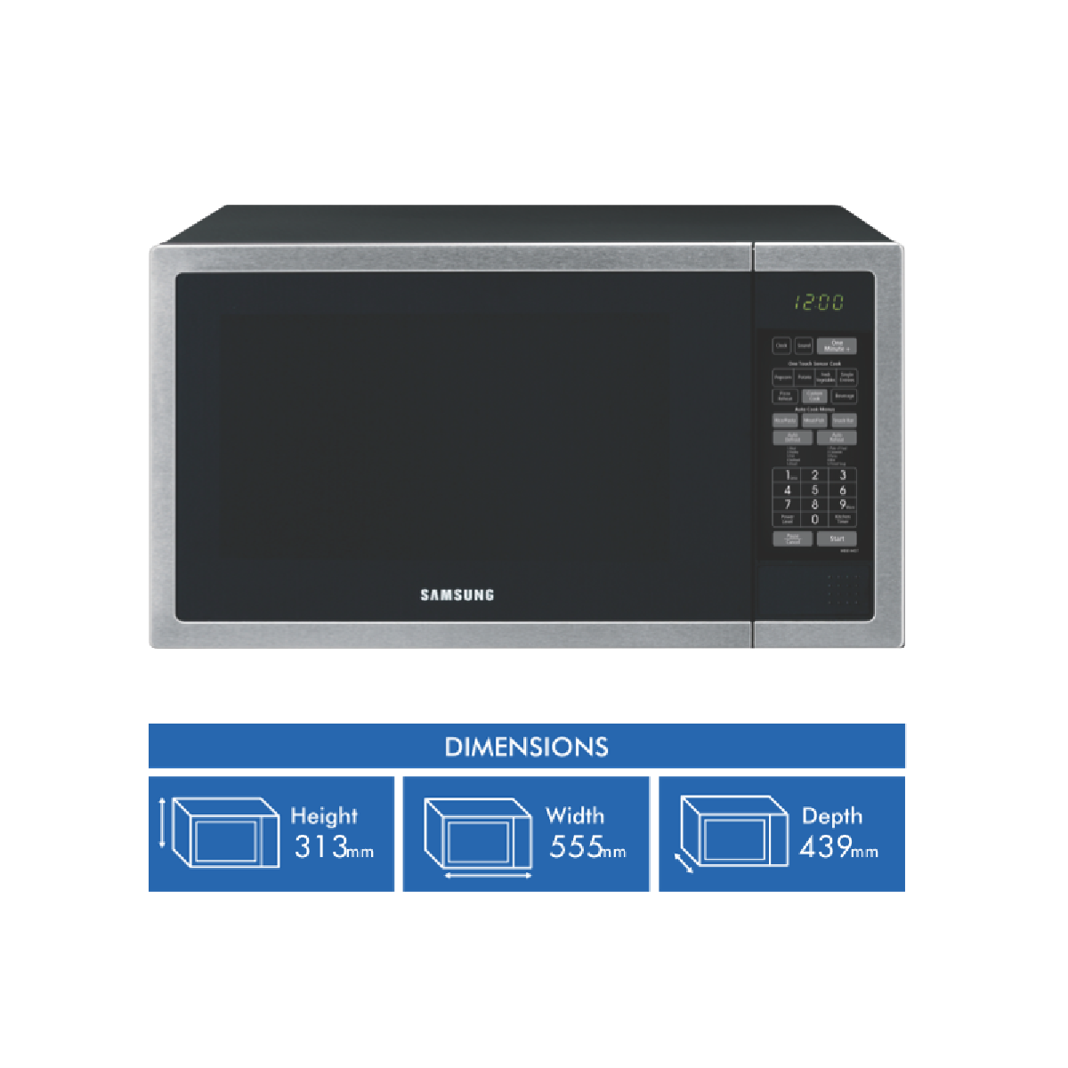 This Samsung microwave oven has 1000 watts of power and a 40 litre capacity. Its 360mm turntable diameter lets you heat large bowls of soup. You can settle cooking time dilemmas once and for all with the Samsung ME6144ST's 21 cook menus. It has 10 power levels allowing you to adjust the power level while cooking. The ME6144ST microwave oven's auto sensor lets you never worry about over heating leftovers. Plus you can auto-cook potatoes fresh vegetables and more with its touch control panel. The ME6144ST has a stainless steel finish. It features a 555mm width a 313mm height and a 439mm depth. The Samsung microwave oven has a 2 year manufacturer warranty. Thaw frozen meats and vegetables with help from this Samsung microwave oven.