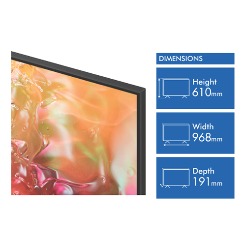 With an impressive 43 screen size the Samsung DU7700 Crystal UHD Smart TV brings your entertainment to life. Powered by Samsung's Crystal Processor 4K this LED TV delivers a stunning 3840 x 2160 4K resolution for immersive viewing. Dual LED technology produces pure whites and deep blacks while the Tizen operating system gives you instant access to popular streaming apps like Netflix and Stan. Hands-free voice control via Alexa allows you to easily browse content and control TV settings. Connect up to 3 HDMI devices or plug in your USB to access photos videos and more. Weighing just 7.4kg this slim and stylish TV can be wall mounted to save space. With a 4-star energy rating you can enjoy the DU7700's brilliant 4K picture quality without excess power bills. UA43DU7700WXXY is the manufacturer's part number for this TV. Bring home the ultimate 4K viewing experience with the Samsung 43 DU7700 today.