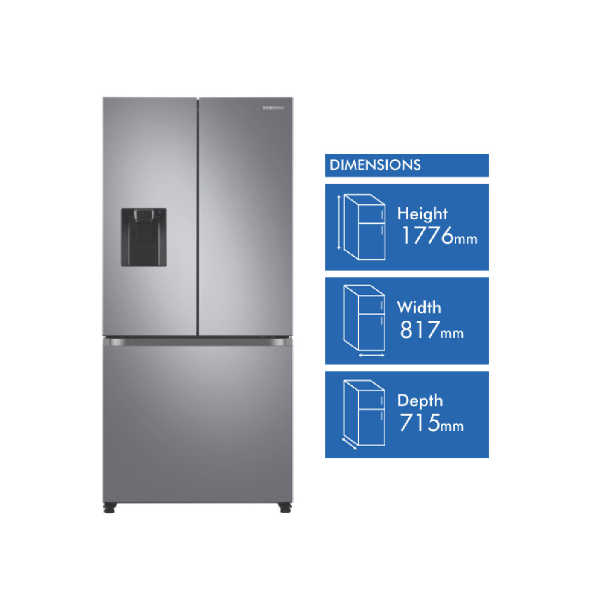 Premium design and excellent functionality come together with the Samsung 495L French Door Refrigerator (SRF5300SD). Keeping your fridge and freezer separately cool is the Twin Cooling Plus technology(1); this feature keeps odours isolated to each area and maintains the perfect temperature and humidity for food preservation. Power Freeze distributes a fast current of cold air into your freezer to quickly chill your frozen food. The Power Cool function similarly blows cold air into the refrigerator cabin to promptly chill food and drinks. Refreshing water is always available without the need of a tap; the built in water dispenser provides refreshing chilled water from the fridge without installation(2). The large capacity door bins allow easy access to large bottles and jugs with compromising on space. Also the large capacity crispers provide even more space to store your favourite fruit and vegetables. The Auto Ice Maker ensures you have access to a large quantity of ice all year round(3). The exterior of the Samsung fridge comes with an Anti-Fingerprint finish; this prevents left over fingerprints from staying on the outside surface keeping its high quality aesthetics. Constructed to fit into the Australian Kitchen this French Door Refrigerator can fit within a standard 1800mm high / 900mm wide cavity(4). (1) Based on testing comparing Samsung Twin Cooling Plus with Samsung All Around / Mono Cooling Systems. (2) On demand water from the dispenser is subject to the container being re-filled. Bisphenol A (BPA) is found in polycarbonate plastics and epoxy resins which are often used in food and beverage containers and has been linked with possible adverse health effects. (3) On demand ice from the auto ice maker is subject to the unit being plumbed. (4) Fits a standard 1800mm high / 900mm wide cavity. Please review full fridge dimensions to determine suitability.